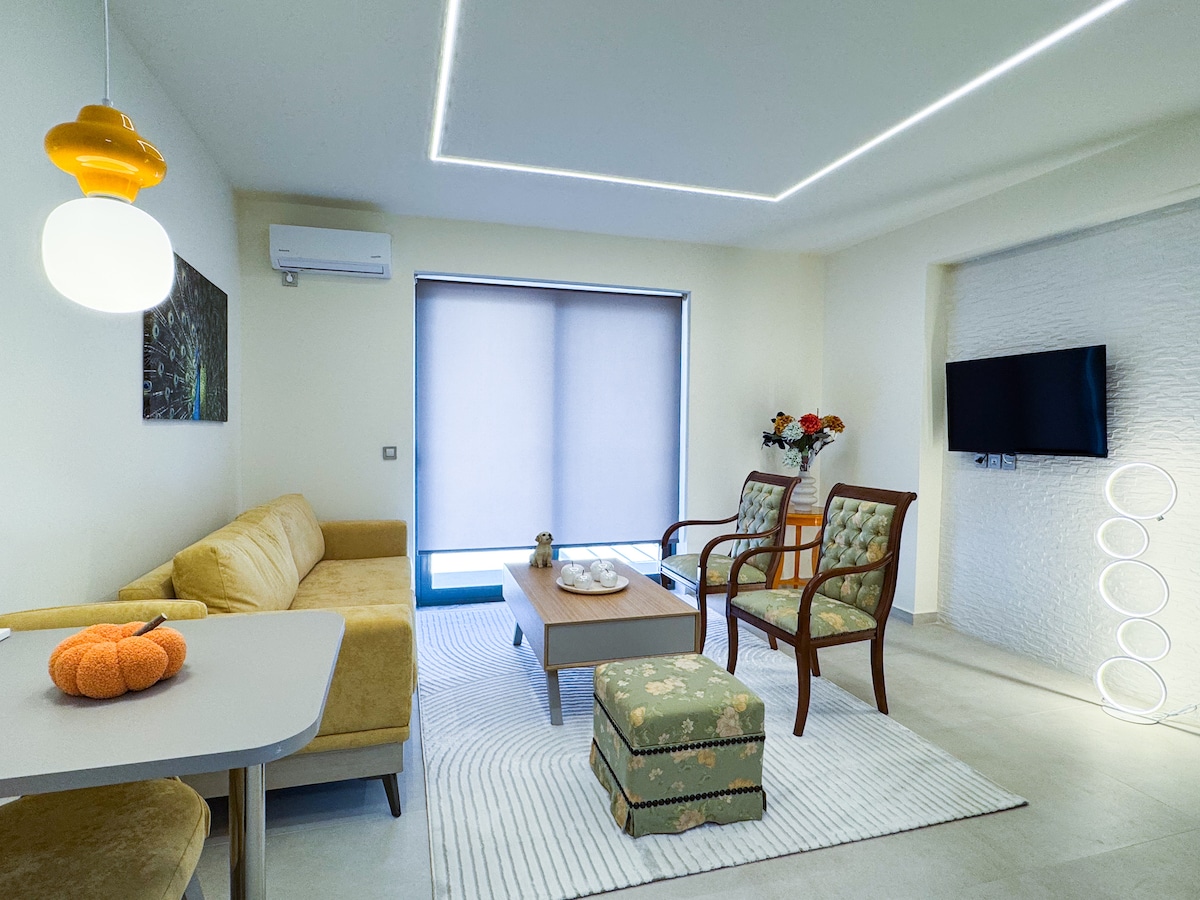 L'apartament es troba a 200 metres del mar, en un barri tranquil envoltat de vegetació. És totalment nou respectuós amb el medi ambient i és una casa intel·ligent. Disposa de tres balcons gratuïts per a totes les festes , totes les habitacions disposen d'aire condicionat, cuina nova, llar de foc, barbacoa , bany amb banyera i dormitori amb un gran llit «king size». Tota la casa té un terra de dutxa de fusta, mentre que de totes les seves obertures la sensació de llum i vegetació calma l'hoste.