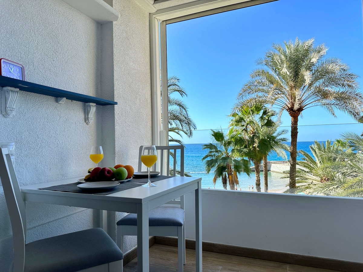 L'apartament estudi completament reformat es troba al quart pis i tens una vista fantàstica de la platja i la piscina natural. L'apartament ofereix tot el que necessites per gaudir d'unes vacances relaxants: Cuina petita ben equipada amb microones, televisor intel·ligent, rentadora. Les grans finestres corredisses de vidre donen una gran sensació d'obertura al mar. La millor ubicació per a les teves vacances relaxades o per explorar l'illa.