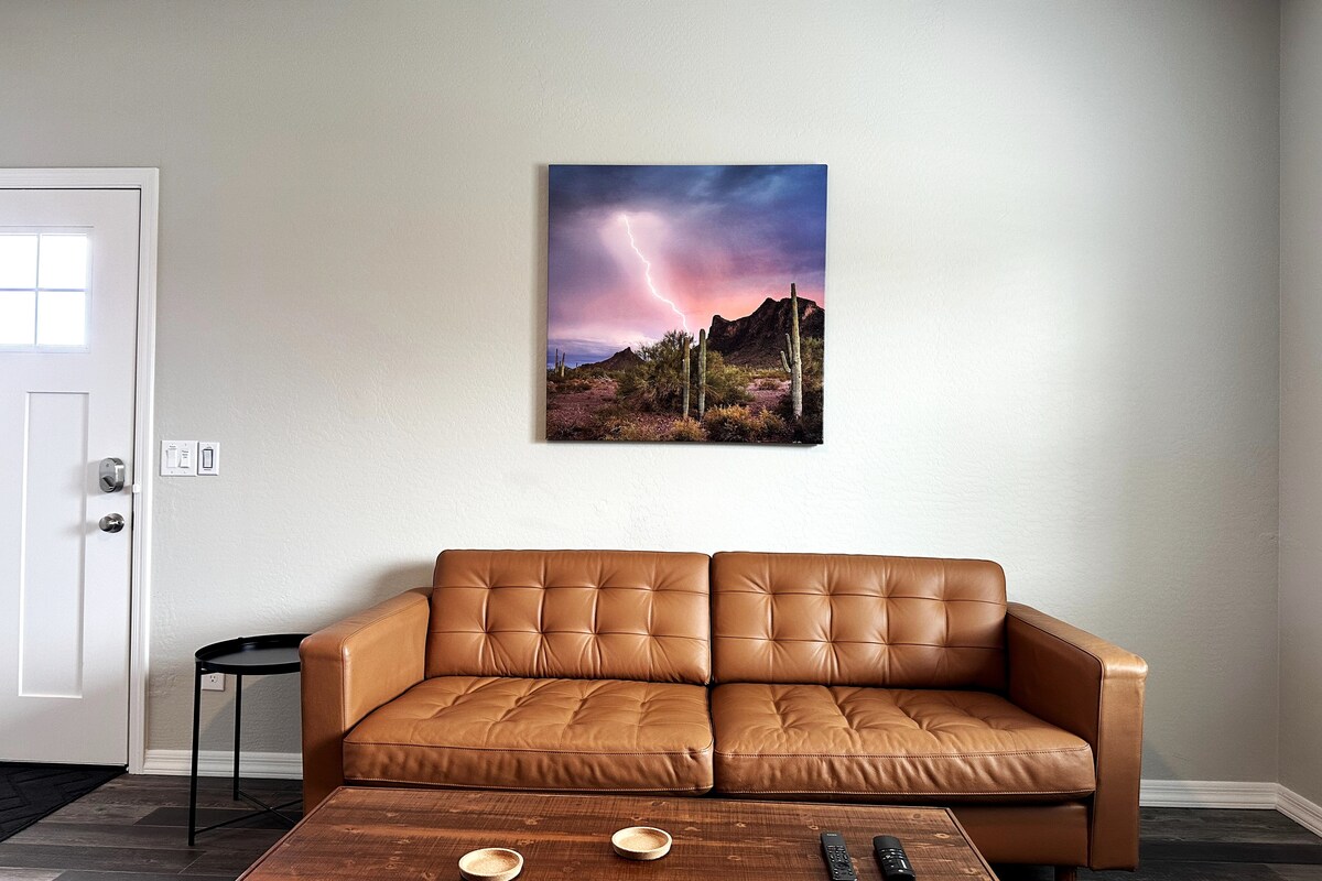Welcome to our chic, modern suite in Casa Grande, Arizona! Experience unmatched comfort in this spacious retreat, complete with a kitchenette, private patio, and in-suite washer/dryer. Enjoy privacy with your own entrance and street parking. Our cost-effective, contemporary stay offers a superior alternative to pricier local hotels. Embrace the luxurious home-away-from-home ambiance in this 2021-built haven, ideal for relaxation or a productive work trip. Your Arizona adventure starts here!