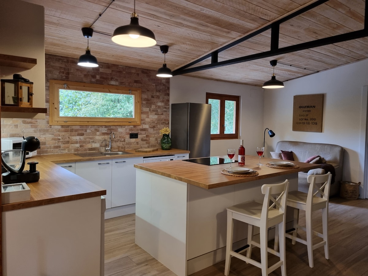 El graner té un saló menjador amb una cuina negra, un dormitori amb un llit doble, un altell amb dos llits i un sofà llit a la sala d'estar. També té una dutxa doble amb finestra perquè puguis admirar la natura mentre et dutxes. Llar de foc, piscina i riu. I un entorn amb un conjunt monumental format per una església romànica amb cripta, un cementiri modernista i un poble ibèric a 5 minuts. Espectacular! A 5 min d'un restaurant rural i a 10 min del poble/ciutat.