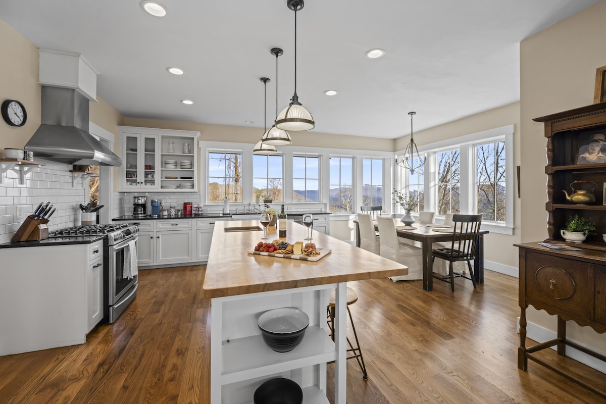 Masia moderna amb vistes a les muntanyes! A només 6 minuts de la carretera i a 12 minuts del centre d'Asheville. Les vistes que té permeten gaudir d'albades i postes de sol impressionants! Gaudeix dels voltants des del nostre porxo frontal envoltant, el porxo posterior aïllat o el bonic pati de pedra amb una gran zona de foguera i un spa de luxe! A l'interior, la nostra abundància de finestres permet relaxar-se amb llum natural i vistes a tot arreu. Una autèntica escapada a la muntanya a prop de la ciutat!