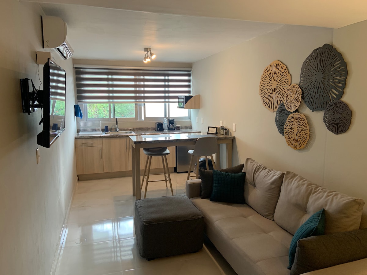 Loft petit amb tot el necessari per gaudir d'una estada agradable - Cuina privada amb graella, refri, micro, estris; estalvia i fes la teva superfície. - Bany privat i espaiós -Escritorio Amplio y Wifi Veloz, treballa des d'aquí - Llit de matrimoni, descans i veu el televisor intel·ligent en un matalàs còmode. -Expacio Suficient, guarda la roba doblada o penjada - Finestres espaioses, bona il·luminació i ventilació. Excel·lent ubicació per al turisme, els viatges de feina, els estudiants o la sortida en parella