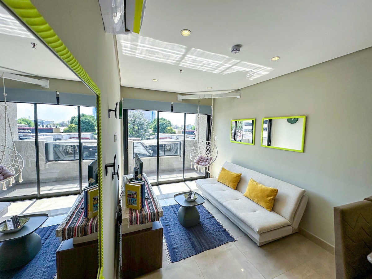 La ubicació és perfecta per a viatges de relax, negocis i tràmits. Ideal per a viatgers en solitari, parelles, nòmades digitals i grups de fins a 3 persones. Allotja't en un apartament modern i súper equipat amb balcó, graella, vista panoràmica des de la planta 24 i els serveis superiors: - piscina - Quincho - Un cinema - Coworking Zona segura i residencial a prop de tot: restaurants, botigues, empreses i botigues. A 5 minuts de l'eix corporatiu. Inclou wifi, televisor intel·ligent i seguretat les 24 hores.