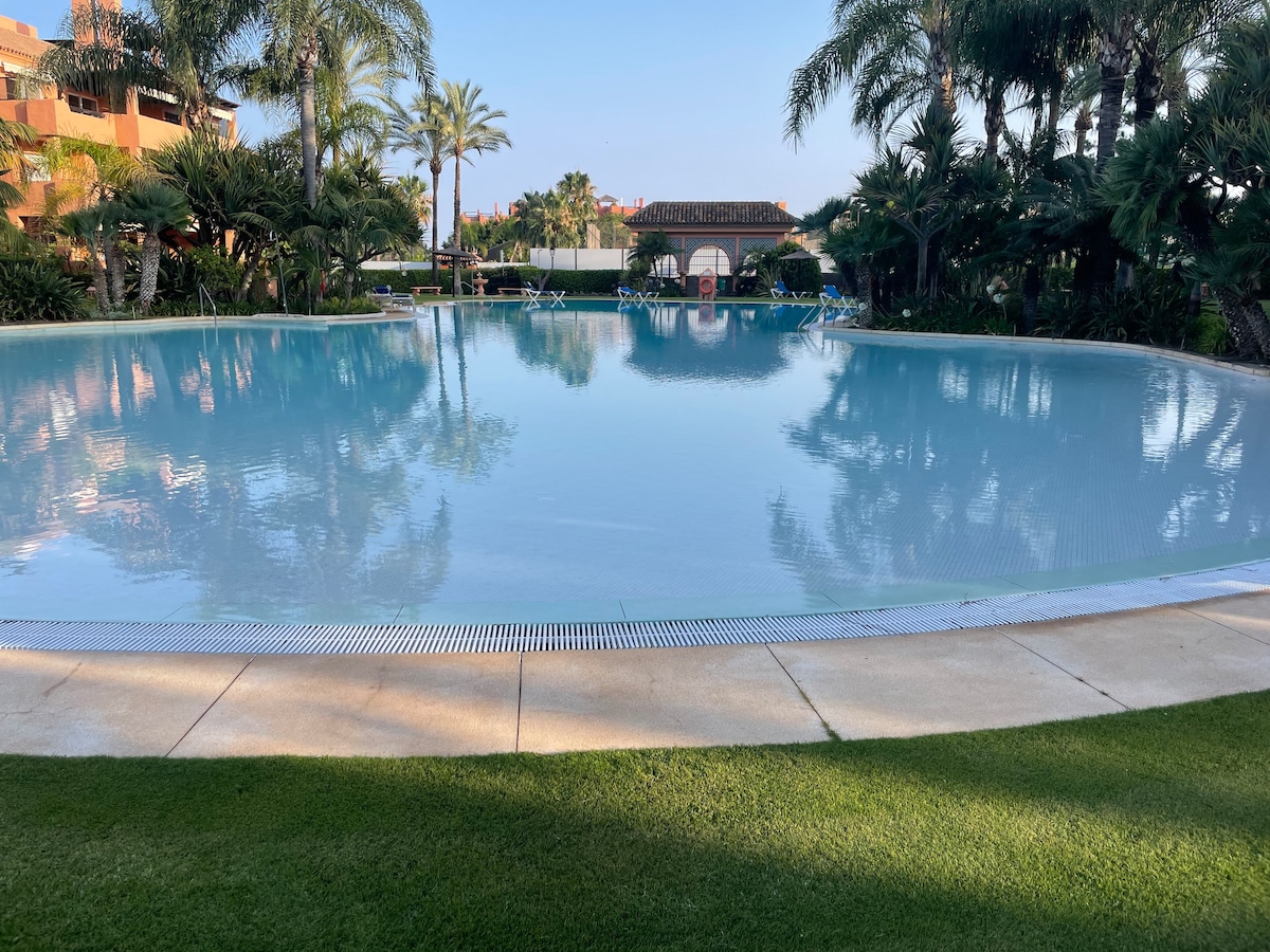 Acollidor pis de 120 m2, planta baixa, 2 dormitoris i amb jardí individual i sortida a grans jardins comunitaris, situat en una magnífica urbanització de luxe amb 5 piscines, una d'elles climatitzada a l'hivern, seguretat les 24 hores, pistes de tennis i pàdel. Situat a la nova Milla d'Or de la Costa del Sol, al costat de camps de golf (Guadalmina, Atalaya), a 5 minuts a peu de la platja, a 5 minuts en cotxe de Puerto Banús i Benahavis, i a 10 minuts de Marbella i Estepona.