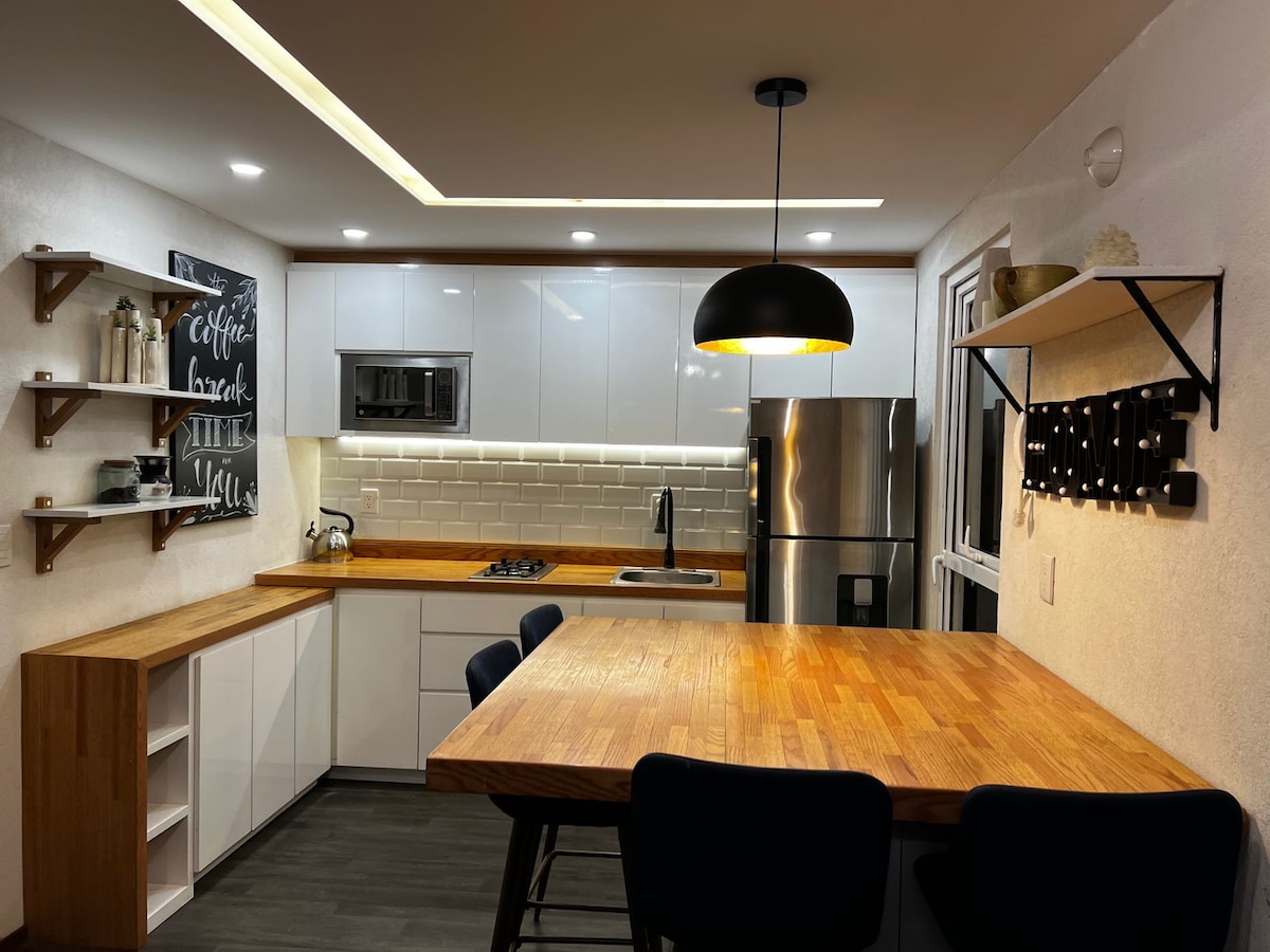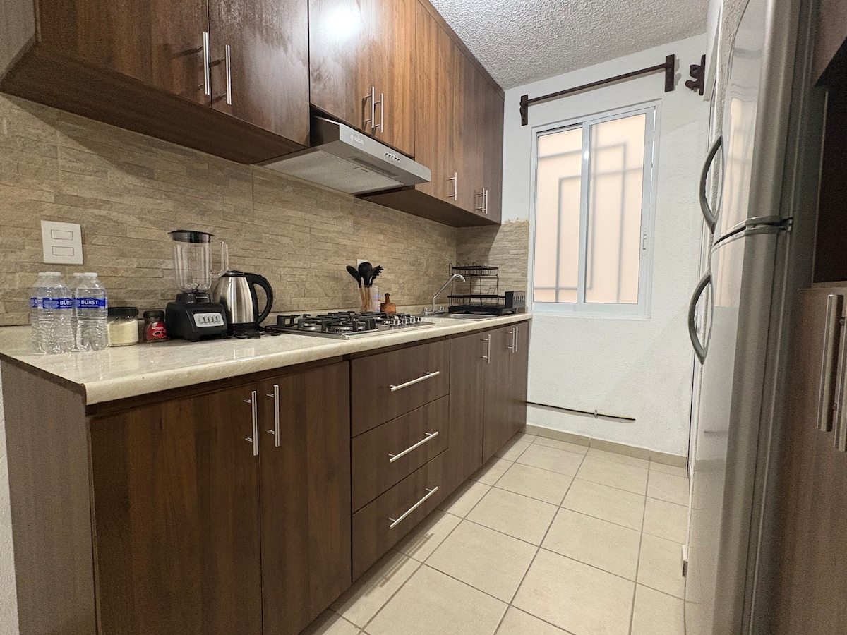 Relaxa't en aquest espai tranquil i privat a 5 minuts de Ciudad Salud IMSS, ISSSTE i hospitals, ideal per a treballadors sanitaris i corporatius situats en una zona exclusiva de la urbanització Tres Marías, a prop d'oficines corporatives, club de golf Tres Marías i a només 15 o 20 minuts del centre de Morelia en cotxe. L'apartament té dos dormitoris i dos banys complets, una cuina i una sala d'estar. Sean Bienvenidos.