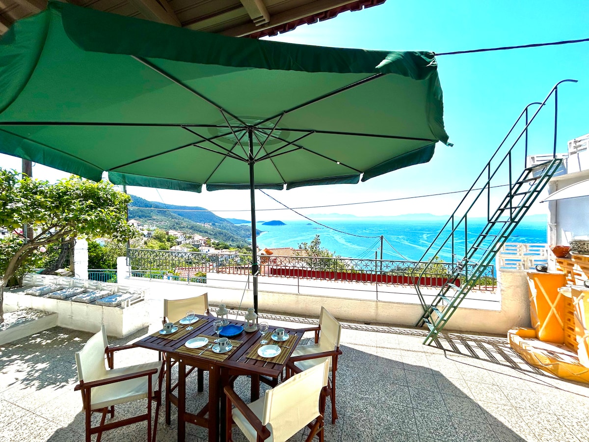 Rious House right next to the legendary Rious fountain! The house is located near the center of the village of Glossa. It is a one floorhouse. There is 1 bedroomwith a double bed,a living room with a double sofa bed and a single bed if needed, a large kitchen and a large bathroom. The breathtaking balcony overlooks the Aegean sea, Skiathos and Euboea.