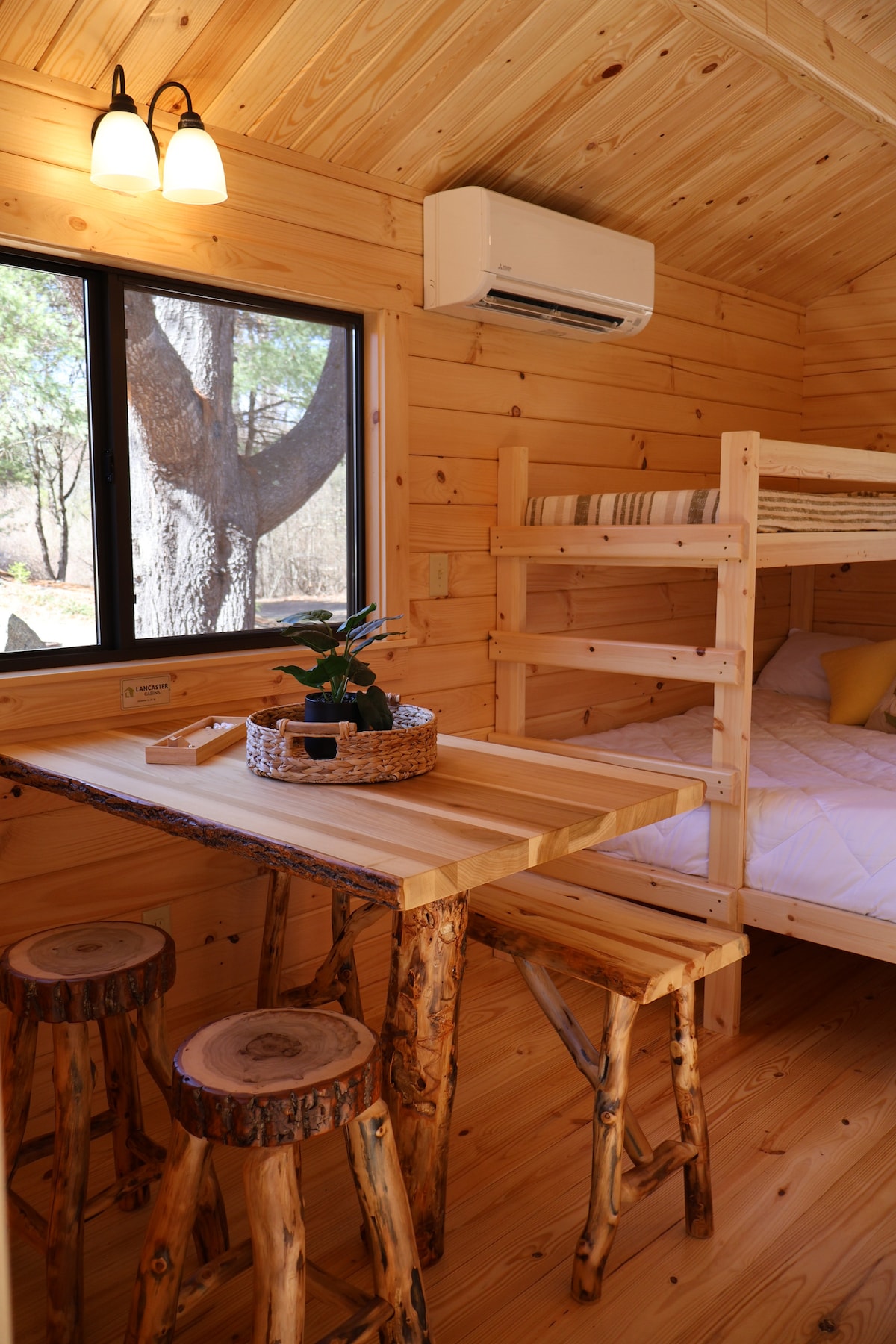 Welcome to our off-the-grid cabin, sleeping 2-4 people with an upstairs loft & downstairs custom Murphy bed. It's equipped with lights, mini-fridge, Bluetooth speakers & an indoor/outdoor bar. Outside you'll find a private fire pit & charcoal grill, a shared outdoor kitchen pavilion w/ gas grill (stocked with cooking supplies) & the outdoor bathroom w/ a real flushing toilet, sink and outdoor shower. Access the Tooky River just steps away and enjoy plenty of space, privacy & beautiful scenery!
