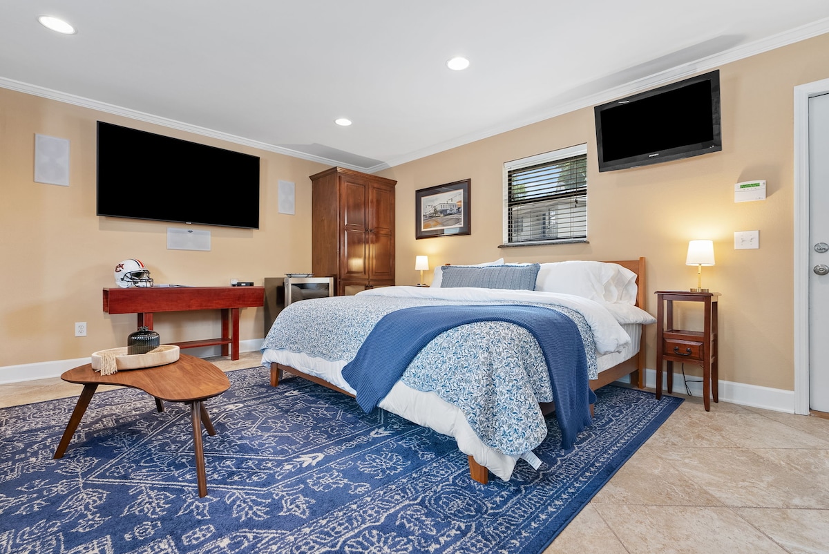 Allotja't a pocs passos del campus en aquest encantador estudi de 28 metres quadrats. Pots arribar a peu a Jordan-Hare en 10 minuts i a Toomer's Corner en 7. Totalment renovat amb cuina moderna, Keurig, llit Murphy, bany d'estil spa i televisor intel·ligent de 42". Gaudeix del cafè del matí o pren una copa després del partit al teu pati privat. Inclou 1 passi d'aparcament i entrada fàcil amb teclat numèric. Ideal per als caps de setmana de futbol, les visites al campus o una escapada a Auburn!