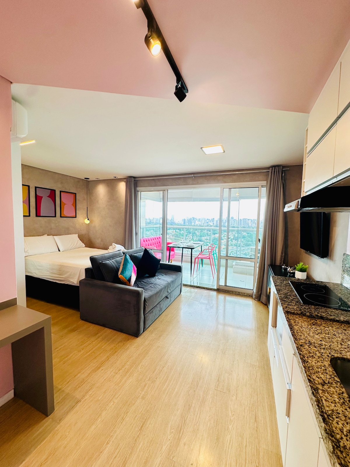 Acollidor i integrat estudi a només una illa de l'estació d'Alto da Boa Vista (Línia Lilac). Confortable per a un màxim de tres adults, amb un llit doble i un llit supletori individual, a més de llençols, tovalloles i estovalles per a una estada pràctica i relaxant. Ubicació estratègica amb accés fàcil a les destinacions més importants de São Paulo: • A 2 km del centre comercial Morumbi • A 3 km del Transamerica Expo Center • A 2 km del consolat dels Estats Units a São Paulo • A 9 km del Circuit d'Interlagos • A 4 km de Vibra São Paulo