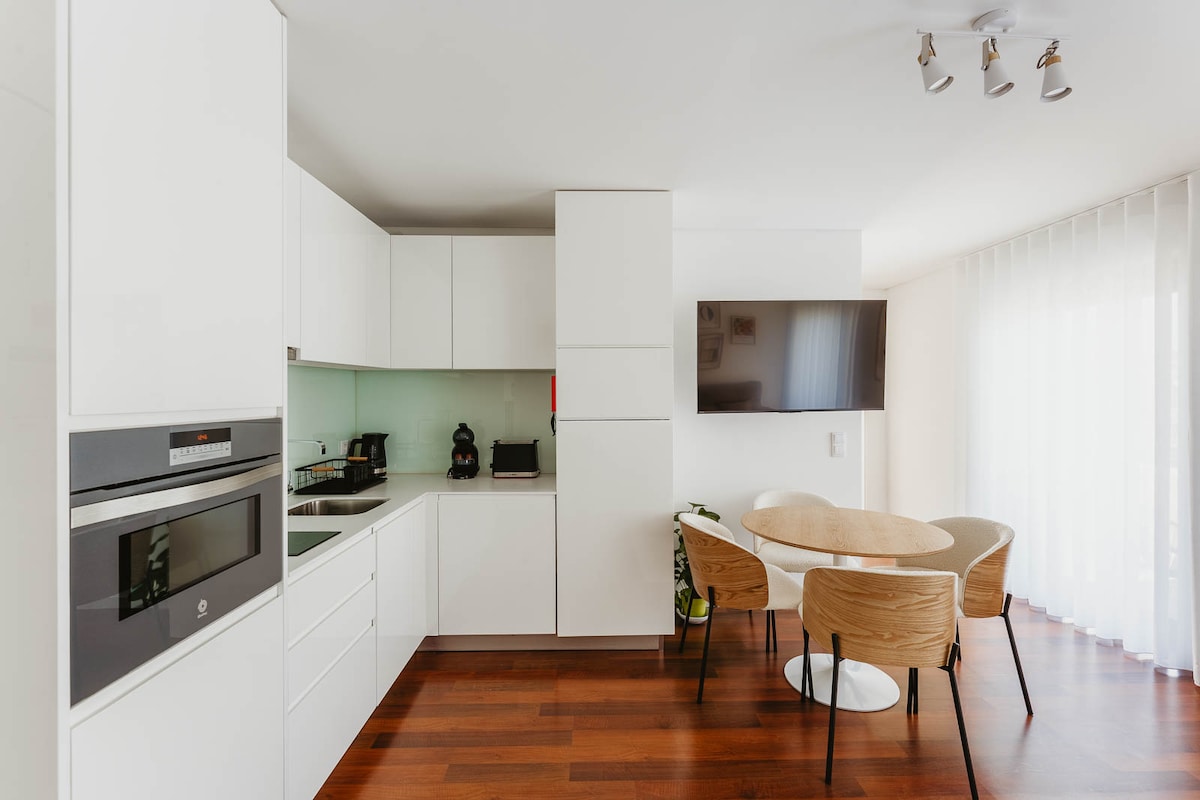 Pis modern i acollidor d'un dormitori al cor d'Aveiro, a la zona de Beira-Mar. Ubicació privilegiada, a pocs passos dels canals i dels restaurants; perfecte per explorar la ciutat a peu. Espai funcional i còmode, amb un llit «king size» (180 cm), una cuina totalment equipada amb rentaplats i rentadora, una sala d'estar amb wifi, aire condicionat i televisor intel·ligent, i un bany amb productes de bany de Rituals.
