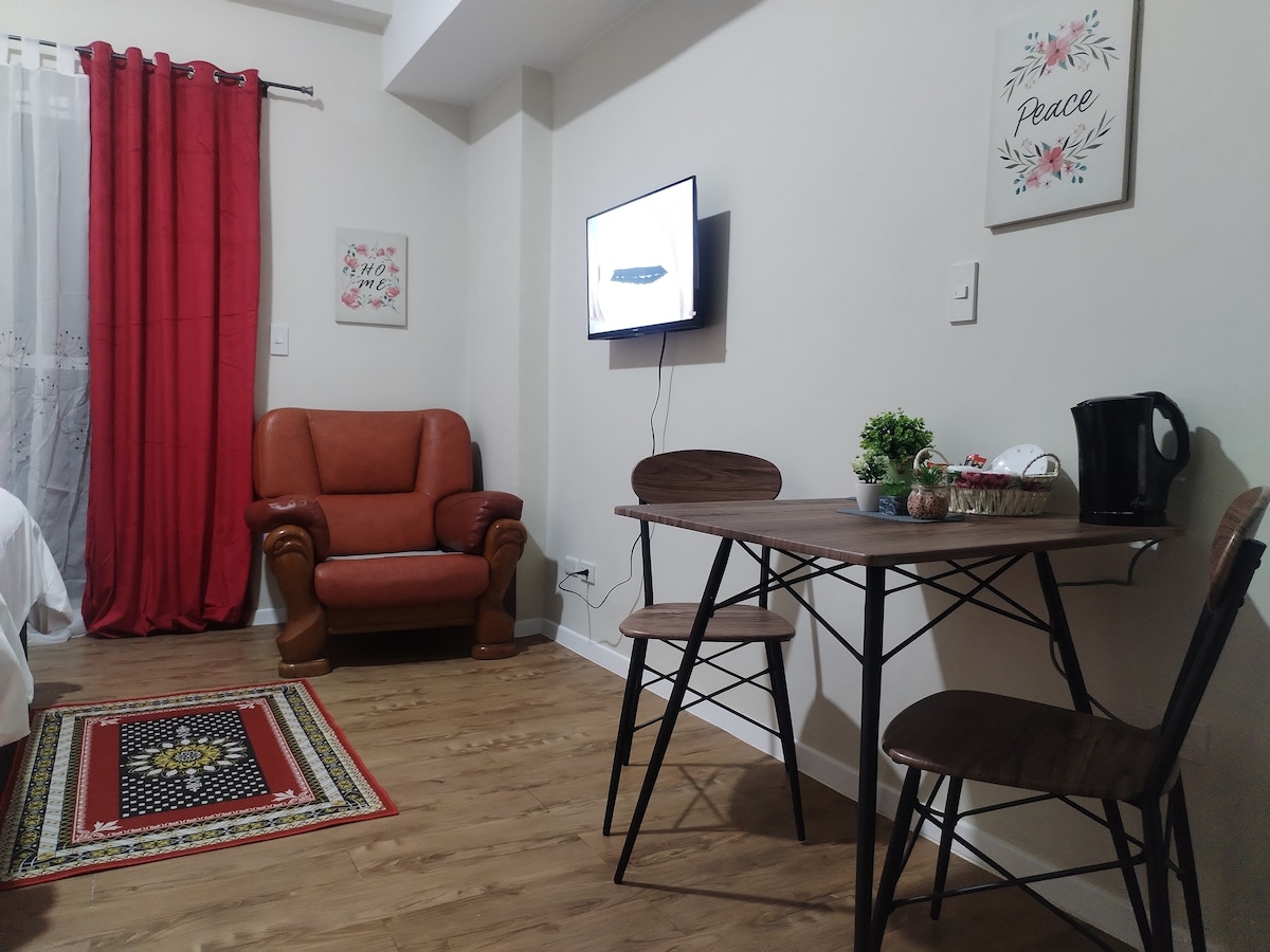 Aquest allotjament t'encantarà. Un apartament assequible per a famílies i lloguer diari de Barkada. Serveis: Piscina per a✓ nens i adults Botiga de conveniència✓ les 24 hores (7/11) Apartament d'un dormitori de✓ 36 metres quadrats amb sala d'estar, menjador, cuina i balcó Habitacions ✓amb aire condicionat Hi ha✓ televisor i nevera disponibles ✓Llit extraïble «queen size» Taula ✓d'ordinador disponible Utensilis de cuina✓ complets ✓amb arrocera i bullidor elèctric ✓Té capacitat per a 4-5 persones ✓Situat a la planta baixa