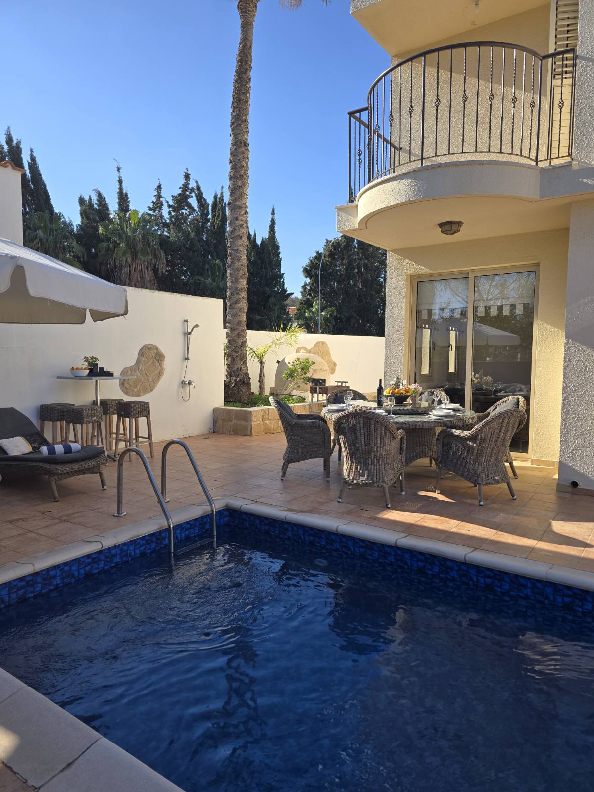 This gorgeous villa offers four bedrooms, two bathrooms, a large kitchen , a private pool and a large living room with a sofa bed and a Smart TV. All rooms have a small balcony and are equipped with air conditioning units. The living room, which is also air conditioned, even offers a large granite fireplace. The two pergola terraces, which are shaded by Cypriote bamboo, offer impressive mountain and ocean views. Everything is taken care of by a lovely housekeeper, who is on call 24/7.