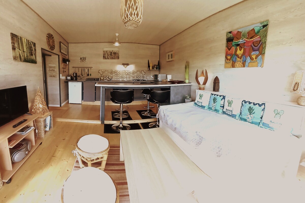 Xalet independent amb terrassa privada. Unes vistes precioses del camp i del bosc. Amb aire condicionat i calefacció. Màxim 2 adults. El llit està fet, les tovalloles de bany es proporcionen de forma gratuïta, així com paper higiènic, líquid per rentar plats, esponges, tovalloles de cuina i productes per a la llar. Els vehicles s'aparquen al llarg dels romarins que s'alineen a la carretera i a la paret de la tanca. La casa del propietari al costat. No hi ha wifi ni televisor. No s'admeten animals de companyia. Els hostes NOMÉS poden fumar a l'exterior.