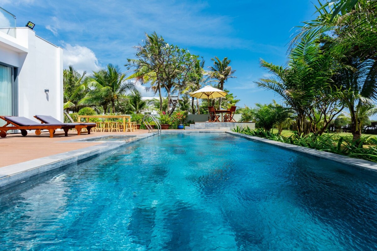 Es tracta de la PISCINA PRIVADA a primera línia de PLATJA VILLA 4 BR+ 4 banys, que pertany a la fase 2 del complex turístic Sanctuary Ho Tram. - Superfície del terreny: 492m2 -4 dormitoris dobles (inclosos 3 habitacions dobles amb balcó amb bany privat + 1 habitació de llit doble a la planta baixa amb el bany fora de l'habitació). - Allotjament 8 adults + 4 nens menors d'11 anys - Enorme terrassa per entretenir-se - Jardins tropicals tranquils i tropicals - Cuina totalment equipada - Piscina privada - Aparcament cobert