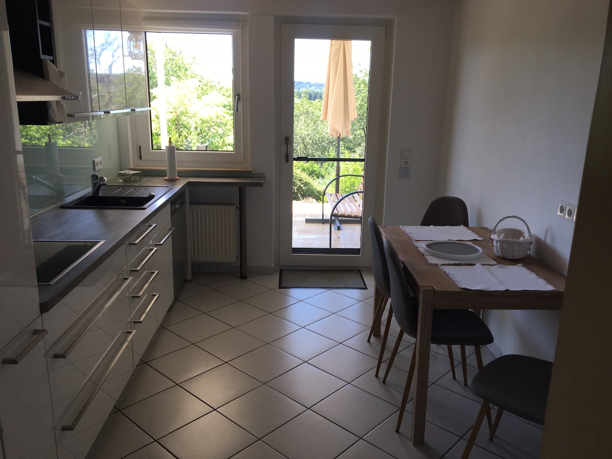 Pis panoràmic de 60 m² – per a un màxim de 4 persones • Llit «king size», sofà llit, llit plegable (a petició), bressol • Cuina totalment equipada: fogons, forn, tetera, cafetera, rentavaixelles, nevera, televisor • Llençols i tovalloles de qualitat, cafè i te • Gran terrassa amb gandula, vistes a la natura Excel·lent ubicació: • A 5 minuts en cotxe / 30 minuts a peu del centre d'Idstein • Rutes de senderisme a la porta • A 20 minuts de l'aeroport de Frankfurt i Wiesbaden • A 2 km de l'autobahn • Parc infantil i restaurant de grill a prop
