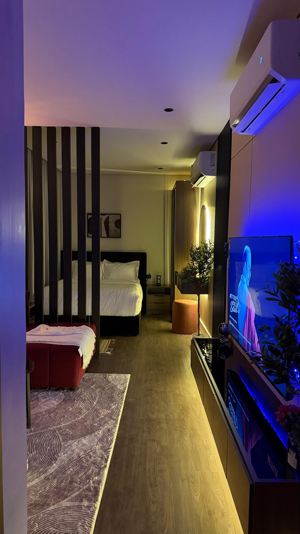 Un apartament d'hotel de luxe situat al cor de la ciutat de Khobar, en un barri elegant i tranquil, a pocs minuts de la Corniche, Prince Turki Street i Hess Square. Compta amb una ubicació estratègica que combina la proximitat a les zones més vitals i un allotjament tranquil. Mobilat amb mobles molt moderns, conté un luxós jacuzzi, amb una il·luminació acollidora que aporta calidesa i elegància al lloc. Nota: Està estrictament prohibit celebrar festes o reunions, per tal de preservar la privacitat i la comoditat de la població. (500 SAR de dipòsit que es reembossaran després de l'hora de sortida)