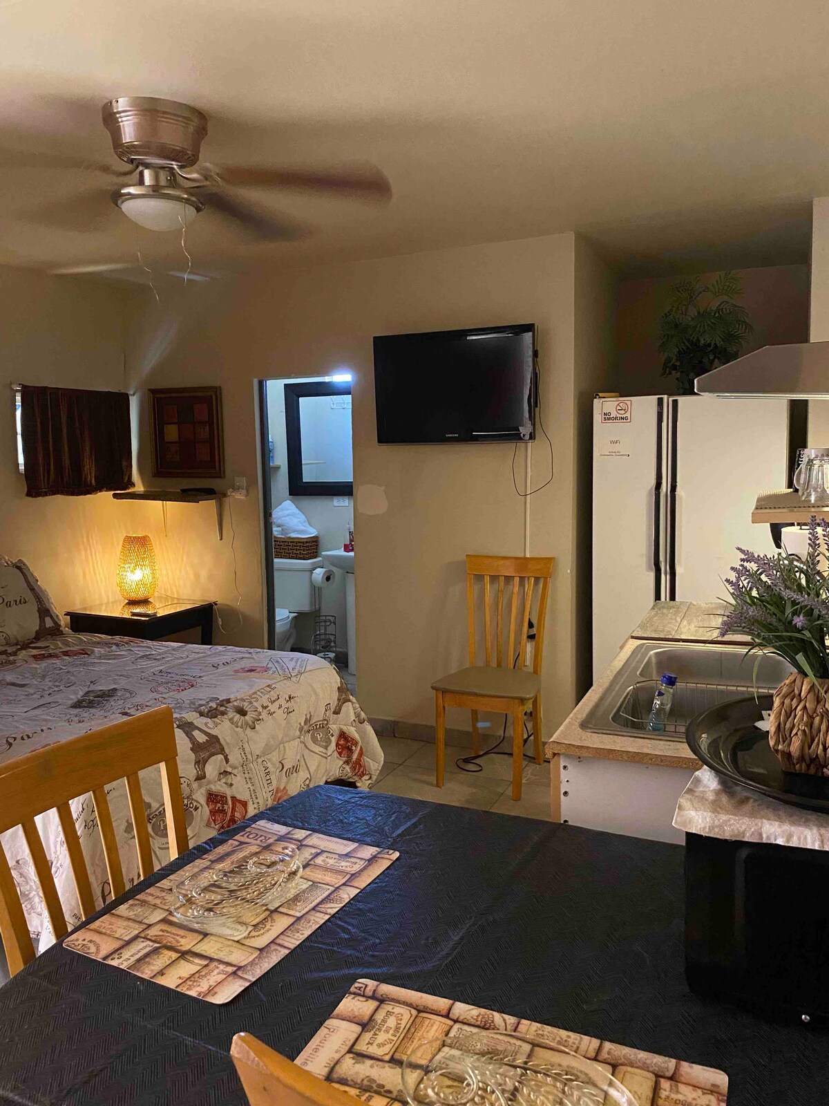 Estudi petit amb bany, independent, molt còmode, llit queen, persona individual o parella, no és adequat per a nadons o nens petits. Hi ha vidre a mà. Molt net, higienitzat a fons. Lluny del carrer, a prop del centre. TV per cable, internet, amb minibar, micro i cafetera, ideal per descansar i/o treballar, assecador de cabells i planxa. Es troba fora de la zona principal de la casa amb entrada independent, porxo d'entrada, completament privat i molt segur.