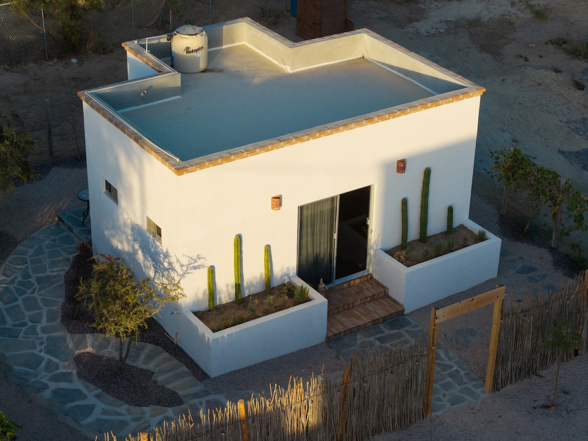 Casita del Sol is surrounded by mountains, Baja desert and Pacific Ocean vistas. Two private floors await your enjoyment, the sound of the surf will lull you to sleep each night. The casita is a romantic hideaway, with a kitchen and full bath. Candlelit dining table overlooks the sea. Sumptuous outdoor lounging area perfect for sleeping, reading, working or relaxing. An infinity-edge hot soaking tub awaits you up a spiral staircase on your private rooftop. The sunsets are spectacular!