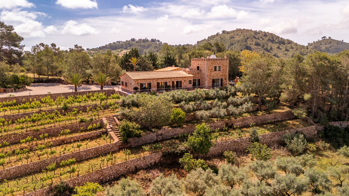 - NEW LISTING - Willkommen in der bezaubernden Finca Es Castell. Ein großes, privates Anwesen mit 5 Schlafzimmern, 4 Badezimmern, einem privaten Pool, eingebettet in 38.000 m² unberührter Natur. Umgeben von Weinreben, Olivenhainen, einem Volleyballplatz und Boccia-Feld bietet es absolute Ruhe und Privatsphäre. Nur Vogelgezwitscher und sanfte Brisen begleiten dich hier. Der perfekte Rückzugsort für alle, die Natur, Weite und authentischen Charme suchen.
