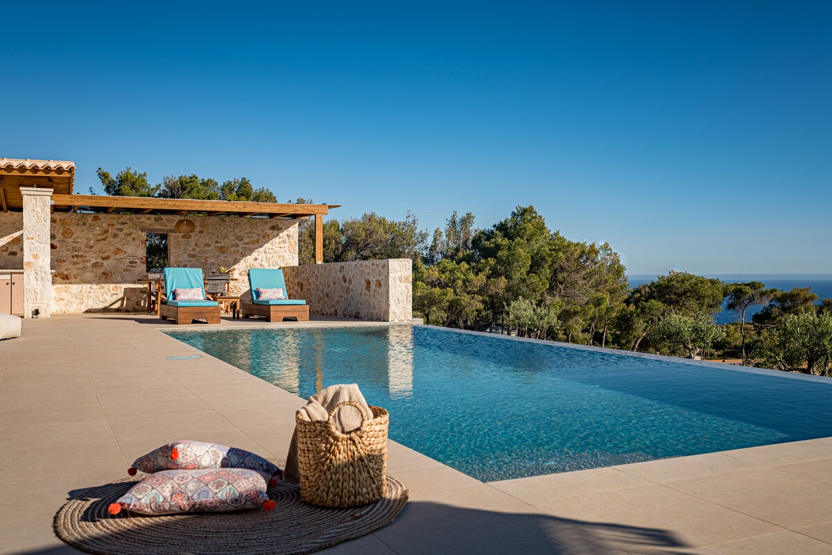 La vila de Versalles està construïda en pedra i comprèn un espai funcionalment independent que ocupa una superfície de 77 m2 i més de 120 m2 de dues terrasses. La vila té enormes espais privats a l'aire lliure en un terreny de 4 hectàrees (40.000 m2), una vista increïble sobre el mar Egeu blau brillant, en una ubicació única i tranquil·la, la part més verda de l'illa, salpicada de rars roures vells classificats com a "Natura 2000". Amb capacitat per a 4 persones, les platges són meravelloses i es troben a només tres quilòmetres.