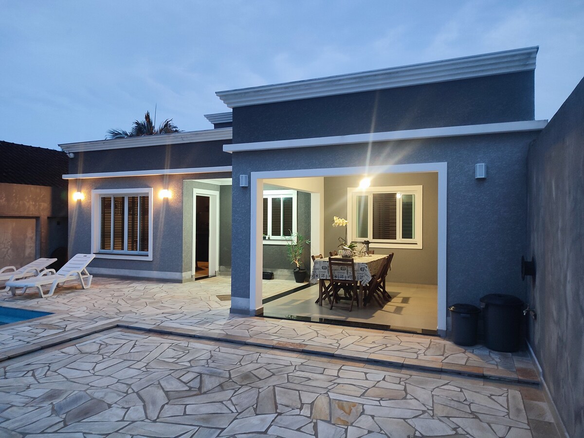 Relaxa't amb tota la família en aquest allotjament tranquil. Casa amb barbacoa coberta i balcó, piscina rodona amb terrassa de fusta i dutxa. 03 dormitoris (02 amb aire condicionat), 01 suite a la zona exterior + 01 bany social. Sala d'estar/TV, cuina americana i mig bany. Mesa per a l'oficina a casa. Wifi. Hamaca per descansar. A 03 blocs de la platja. Parc infantil i camp de futbol al condomini.