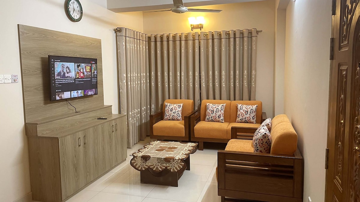 Torna a connectar amb els teus en aquest espai apte per a famílies. A prop de l'aeroport i de tots els serveis. Hi ha botigues de queviures i cadenes de menjar a minuts. Decoració elegant amb totes les instal·lacions de la casa. Sala de gimnàs independent amb molí de comerç elèctric i altres equipaments. Biblioteca exclusiva amb una gran col·lecció de llibres. Tres televisors de 55 polzades, 6 AC, tots els banys amb Geyeser, 6 bateries IPS que cobreixen tot l'apartament a més del generador. Pis de fusta real i rajoles espanyoles. Mobiliari de fusta car.