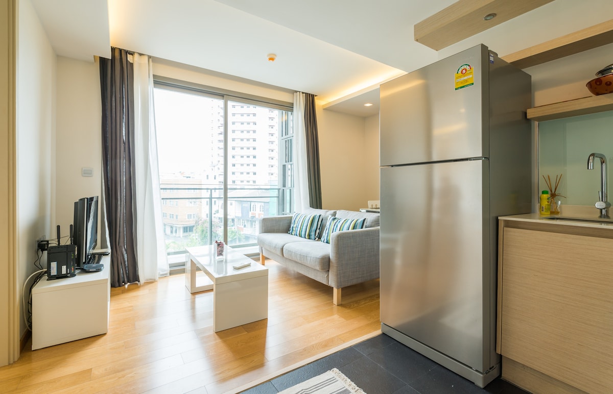 ❤️Habitació acollidora❤️ d'Airbnb, a prop de BTS Asok i Nana a la zona de Sukhumvit, situada al cor de Bangkok(districte financer) L'habitació té una bona vista amb balcó. Tots els electrodomèstics són moderns i nous. Estris de cuina fogons elèctrics amb olla i microones de paella. s'ofereix cafetera i taula de menjador També hi ha una rentadora a la nevera Aire condicionat Planxa Tovalloles de televisió, xampú , gorra de dutxa per al cos, brot de cotó,sabó de mans