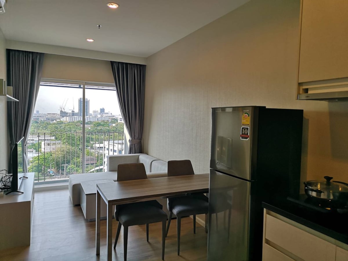 ** Arribada anticipada i sortida tardana gratuïtes! ** Pis modern d'1 habitació al 21è pis amb unes vistes impressionants de l'horitzó de Bangkok. Situat en un edifici de luxe amb alta seguretat i equipament complet a l'habitació: wifi d'alta velocitat, televisor intel·ligent, rentadora/assecadora. Accés fàcil a BTS, taxis i transport públic. La piscina, la sauna i el gimnàs només estan disponibles per a estades llargues, d'acord amb la política de l'edifici.