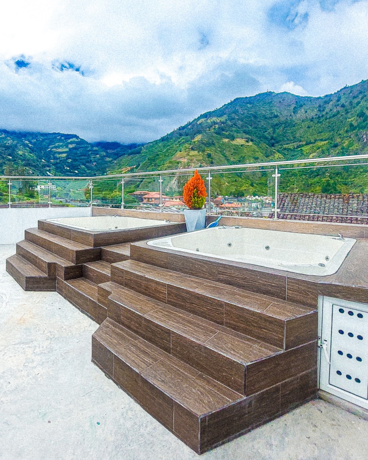 És una casa caseta, situada a 7 minuts del centre de Baños ,plena de zones verdes i jardins ,orquídies i diversitat d'ocells, envoltada de muntanyes i una vista impressionant de la conca del riu Pastaza, única per descansar i relaxar-se en família. Addicionalment pel seu coneixement han de pujar 38 esglaons de ciment i pedra rústica, al final tindran la recompensa de la magnífica vista del riu Pastaza des de dalt i la seva piscina d'aigua calenta recentment inaugurada.