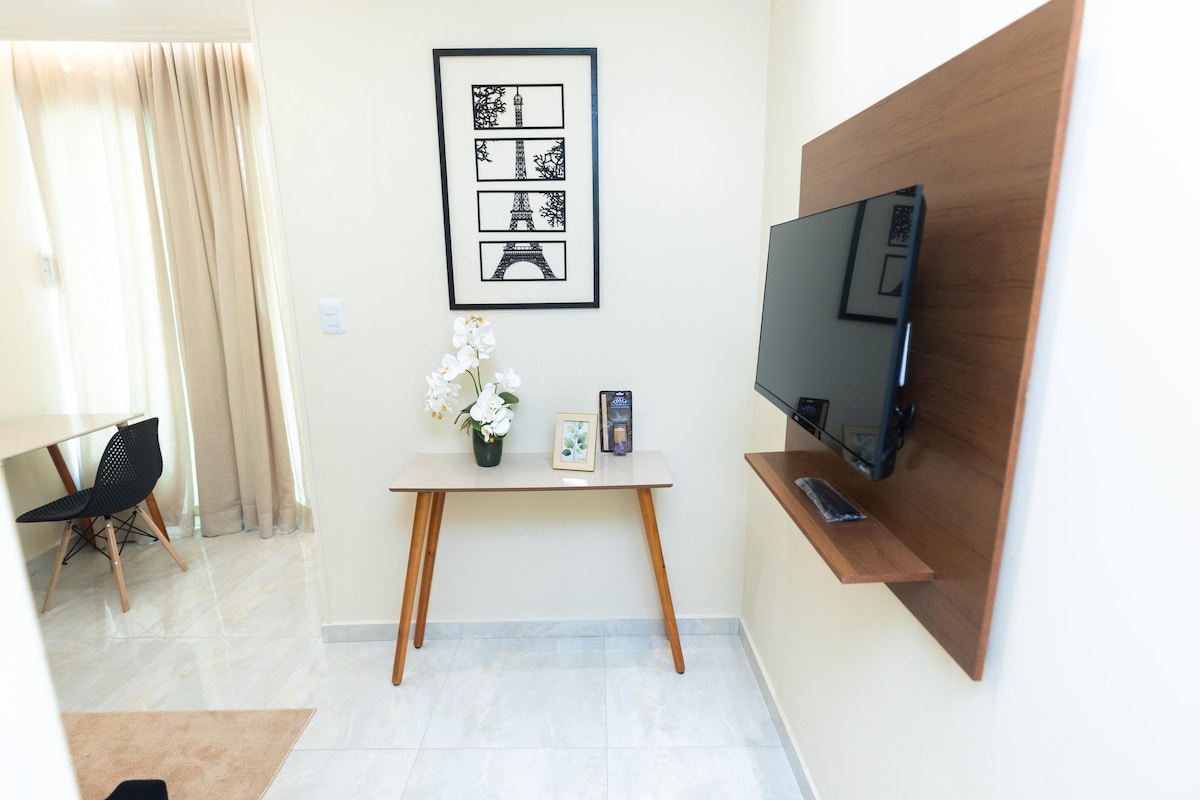 Gaudeix d'una experiència prèmium amb vistes panoràmiques de Belém. L'Estudi destaca per la seva funcionalitat: la partició amb porta separa el dormitori de la sala d'estar, oferint una privacitat superior. Relaxa't al llit doble o al còmode sofà llit (ideal per a un tercer hoste). L'entreteniment està garantit amb el televisor intel·ligent de 65", que inclou Netflix Premium en el pla. La cuina està completa i l'estudi ofereix dutxa elèctrica, assecador i planxa. A més, disposaràs d'un garatge cobert exclusiu perquè puguis aparcar el cotxe sense preocupacions.