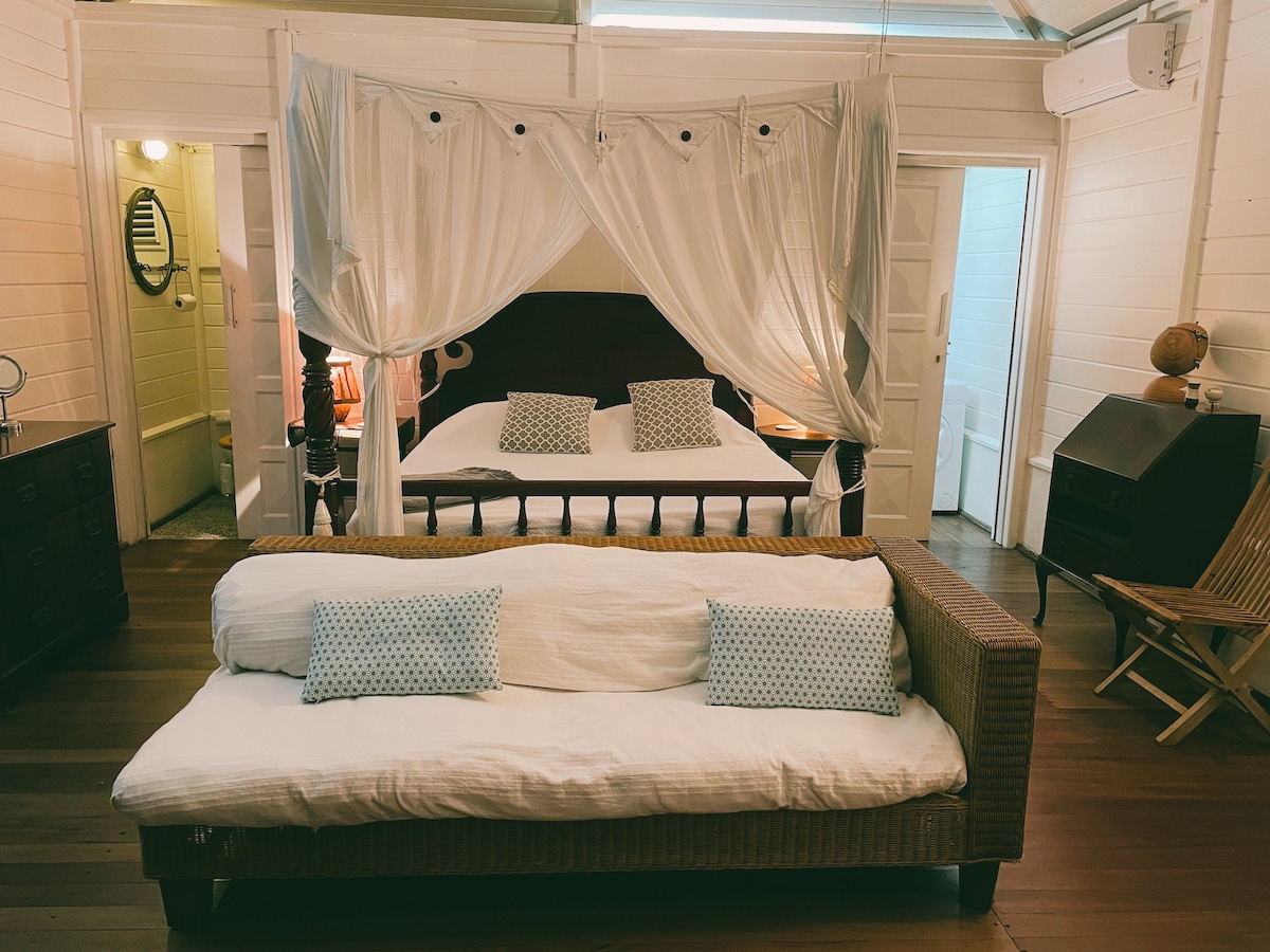 Bon bungalou situat al jardí tropical de la nostra vil·la. Volíem que et sentissis com a casa, amb una decoració neta, un ambient caribeny suau i acollidor i totes les comoditats que ens agrada trobar en el nostre viatge: roba de llit de qualitat, aire condicionat, espai d'emmagatzematge, butaques i llit per llegir, i una cuina totalment equipada (màquina Nespresso, torradora, microones...). Accés a la piscina de la casa principal