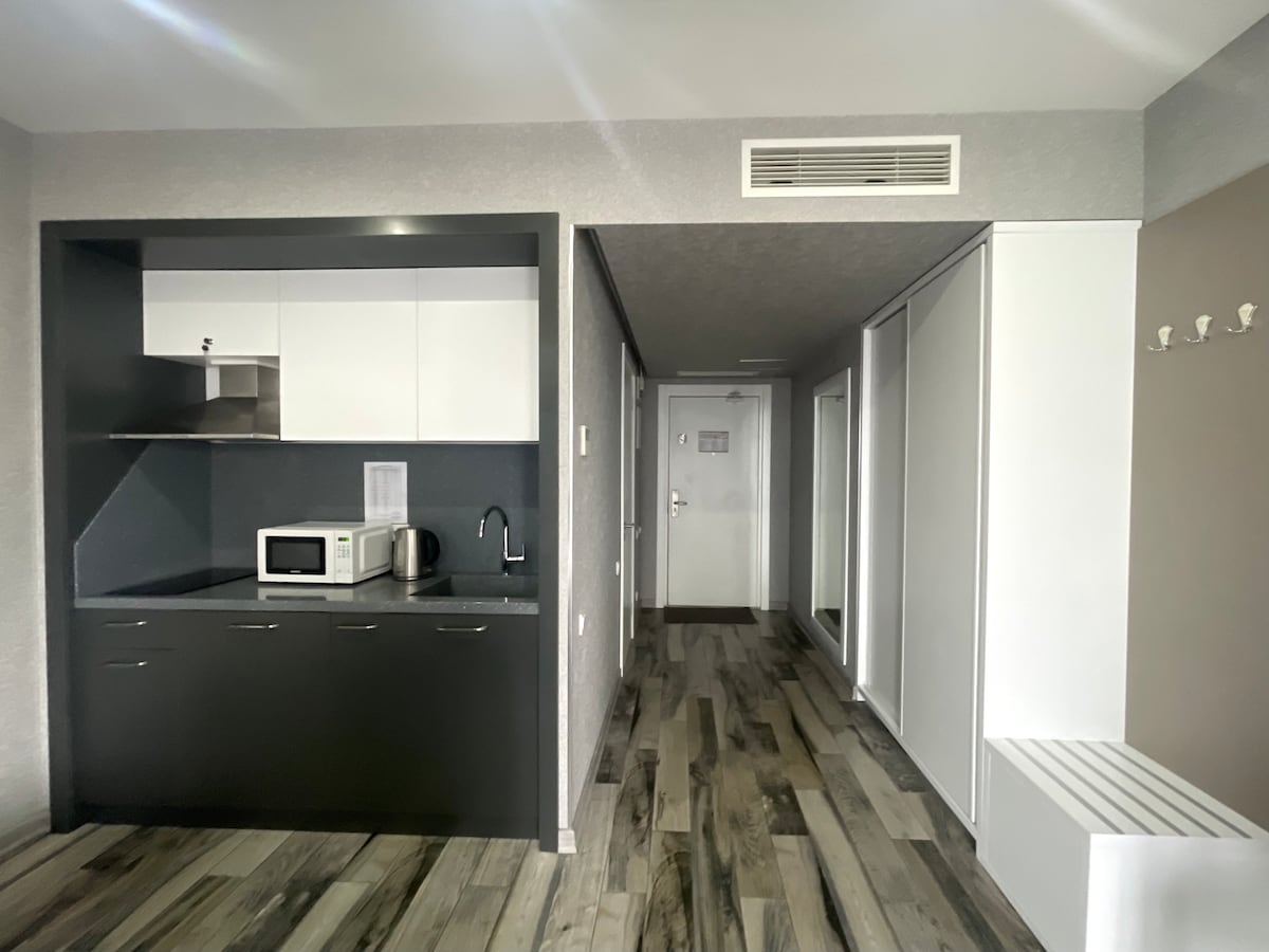 L'apartament està situat en un bloc de pisos nou amb una bona ubicació. El carrer Kldiashvili està situat a prop de l'hotel Sheraton i de les principals atraccions, però és molt tranquil. A prop del bloc de pisos hi ha un parc central, platja de mar, bulevard, centre històric de Batumi. A 300m de l'estudi trobaràs un supermercat. En aquesta zona hi ha moltes cafeteries i restaurants de cuina georgiana i europea. L'estudi té una nova reforma moderna i tot el necessari per gaudir d'una estada còmoda.