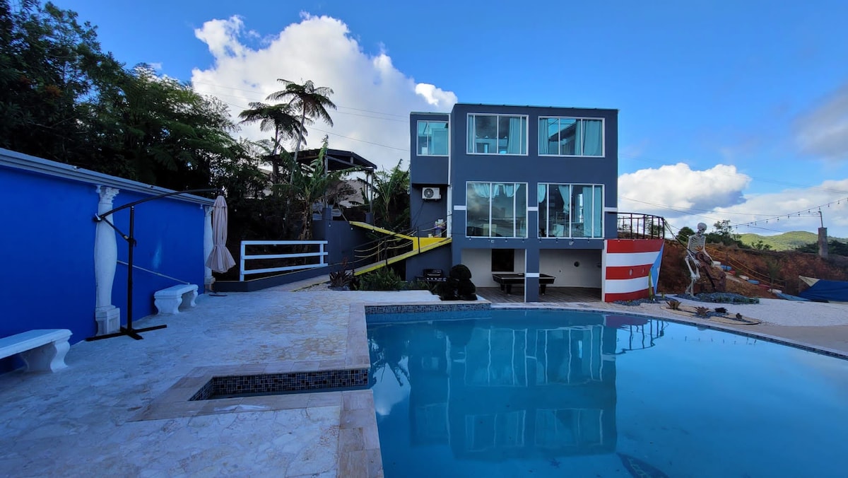 Estem situats a minuts del Centre Geographic de Puerto Rico. Relaxa't amb tota la família o els amics en aquesta masia on la tranquil·litat i la connexió amb la natura es respiren quan arribes. Estaràs envoltat de bells paisatges, que et permetran allunyar-te de la rutina i gaudir d'una vida inoblidable al camp. A 20 minuts a peu o a 10 minuts amb vehicle 4x4 de la casa pots trobar un tresor amagat amb senders, rius i cascades que pots gaudir durant la teva estada.
