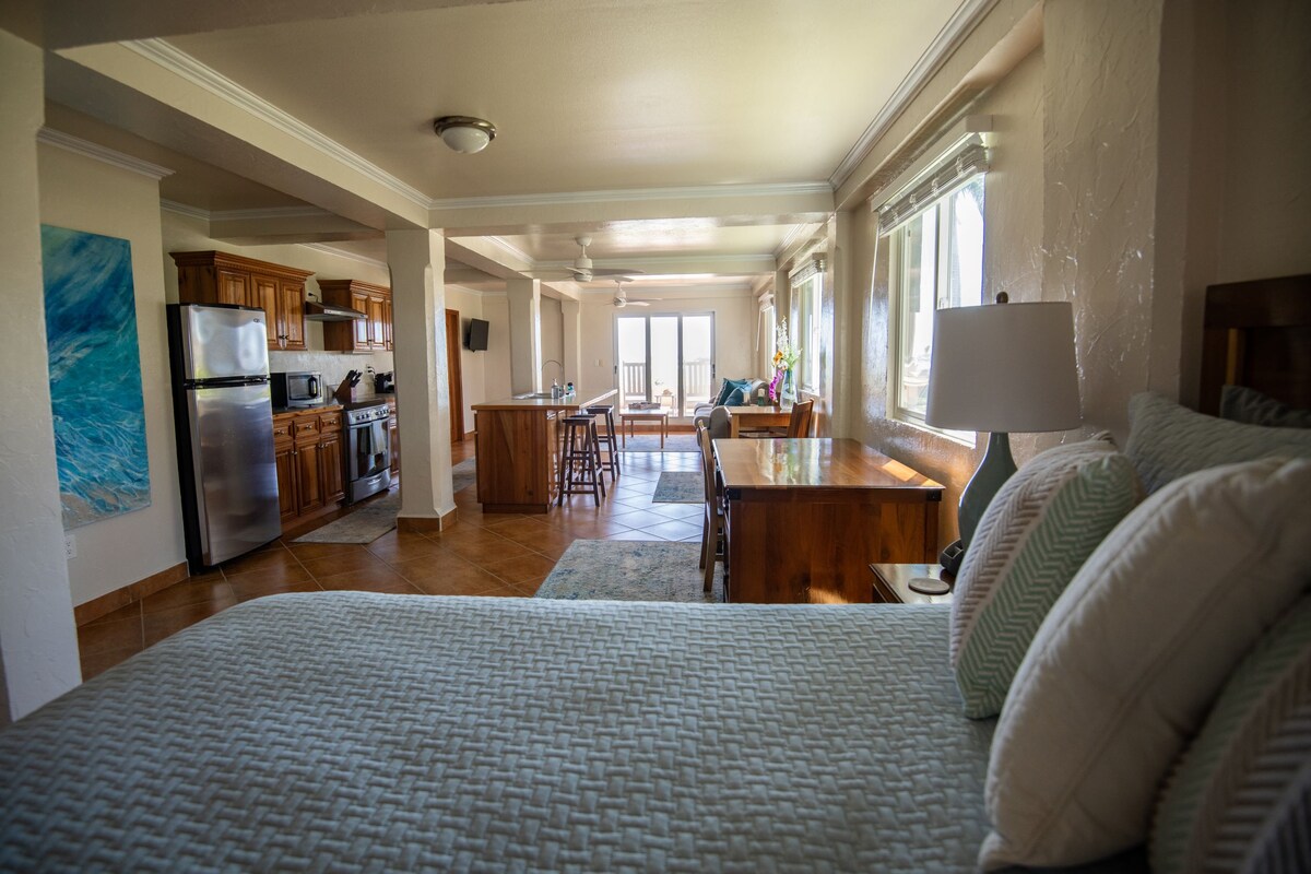 Designed for divers who value comfort between dives, this bright queen room offers everything you need for a relaxed stay. It includes a queen bed, private bathroom, AC, ceiling fan, and Wi-Fi. Enjoy a small private porch and access to our fully stocked community kitchen, perfect for preparing meals or sharing stories with fellow divers in a clean, secure, and peaceful beachfront setting.