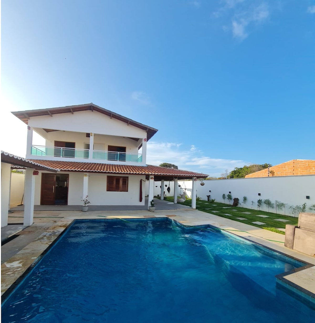 Vine i gaudeix d'unes vacances inoblidables al nostre oasi, a només 300 metres de la platja i a prop dels famosos penya-segats de Beberibe, a Ceará (Brasil). Casa espaiosa, recentment renovada, amb 7 dormitoris (6 són suites), tots amb aire condicionat, llits dobles i ganxos per a hamacs. 700 m² de superfície construïda, piscina, zona de barbacoa, salons i menjadors, i cuina totalment equipada. Diverteix-te amb comoditat, però tingues en compte que no es permet música alta, festes ni bandes en directe, ja que és un barri residencial.