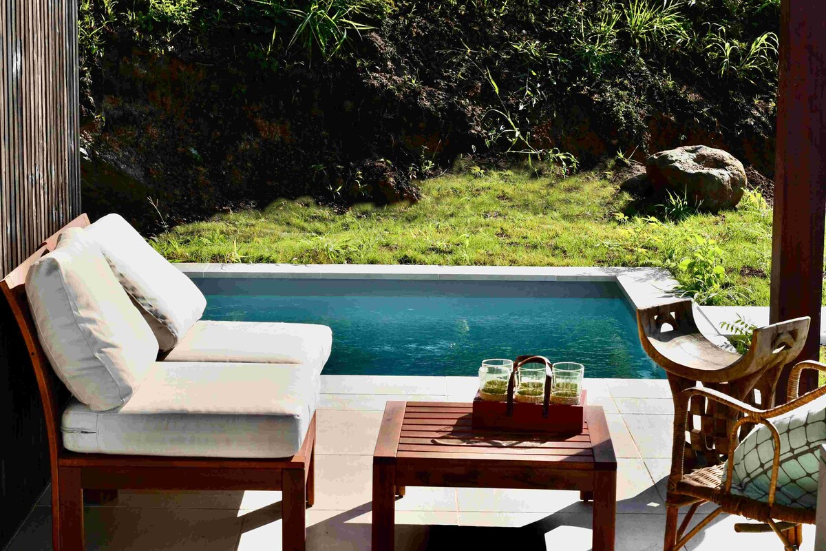 T'encantarà la teva escapada a la nostra "Perla de Jade"! Aquest petit capullo de vegetació, situat a les altures de Case Pilote, inclou: - una habitació entrepà amb llit de matrimoni, aire condicionat, - una petita sala d'estar amb sofà llit, televisor i tot el que necessites per sentir-te com a casa, - una dutxa moderna i decorada amb bon gust, - una cuina petita a l'aire lliure, - una piscina per relaxar-se, sense vis-à-vis, amb una terrassa acollidora per descansar i relaxar-se.