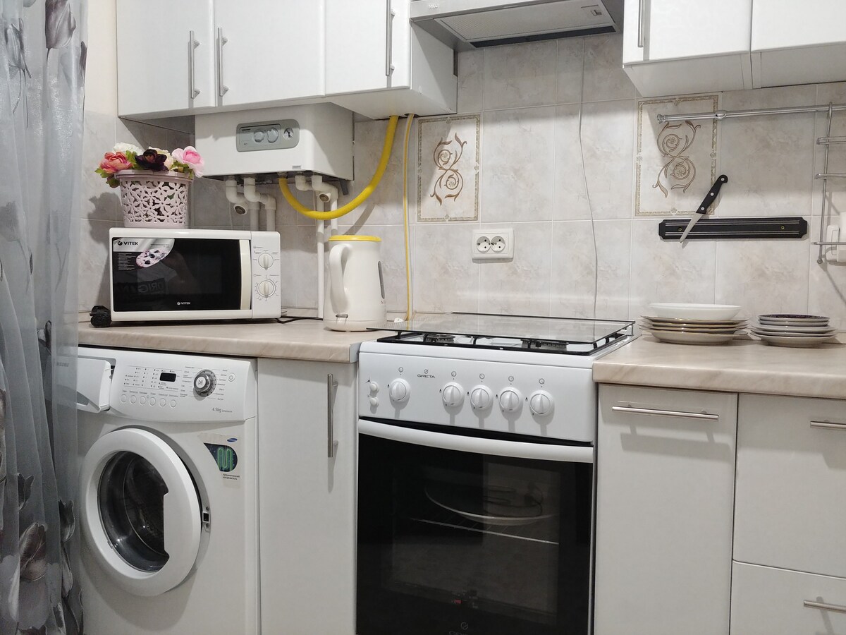 Pis còmode de disseny modern i interior amb totes les comoditats per descansar i allotjar- s'hi, situat en una casa nova de tres plantes a la planta baixa. Els electrodomèstics, els mobles de cuina, l'equipament del bany creen un ambient per gaudir d'una estada agradable. A prop hi ha un centre comercial "Sheriff", un restaurant "Teremok", cafeteries i una cadena de botigues "Praga", que estan obertes les 24 hores.