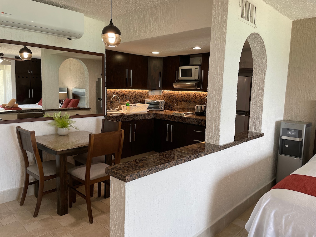 Preciós i ampli ESTUDI a la zona hotelera de Cancun amb balcó que dóna al MAR , a la 3a planta del condomini Solymar. L'estudi disposa d'una petita cuina americana ben equipada amb estris i electrodomèstics. El frigorífic té 11 peus cúbics + congelador. Menjador de 3 places, TV amb Roku, WiFi, dispensador d'aigua purificada, 2 llits QUEEN molt còmodes + 1 futó doble, bany complet amb armari i caixa forta. Subministraments de bany i PLATJA i tovalloles incloses!!