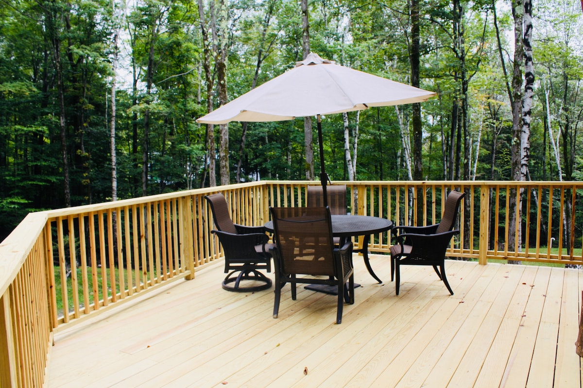 El nostre xalet tranquil té tot el que necessites. Una cuina totalment equipada, 3 dormitoris, 2,5 banys, 2 sales d'estar, llar de foc elèctrica, foguera exterior, rentadora, assecadora, televisors Roku, internet de fibra òptica. Pistes accessibles per a vehicles tot terreny i motos de neu des de la propietat. A 20 milles de Mt. Neu. A poca distància en cotxe de camps de golf populars, botigues, restaurants, cerveseries, piragüisme, pesca, senderisme, ràfting, etc. Un lloc ideal per explorar els boscos nacionals de Green Mountain (VT) o les muntanyes de Berkshire (MA).