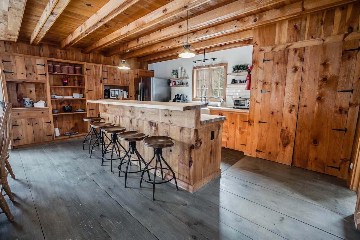 Escape to our historic and lovingly-renovated schoolhouse on a 250-acre verified-regenerative farm, where Green Mountain views meet modern comfort. Unwind in your private hot tub and barrel sauna after exploring farm trails, then fall asleep to the gentle sounds of sheep grazing in the pastures below. This is Vermont at its most authentic—working farm life with all the luxury. Level 2 EV charger, in-unit washer/dryer, and ductless AC for summer comfort.