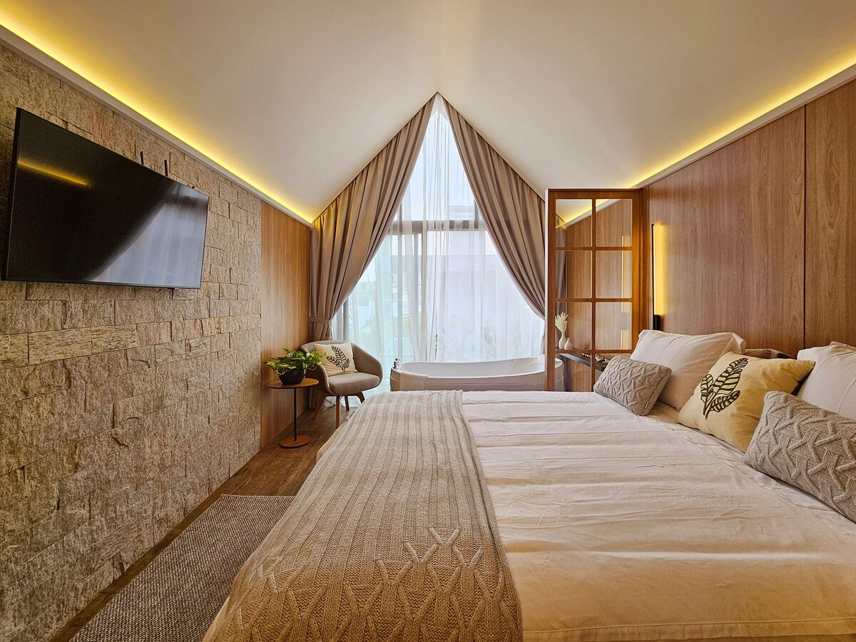 Situada dins de la ciutat, a només 1000 metres del centre, la caseta Malbec té un aspecte intern que barreja el contemporani amb la rústicitat de la zona rural. El revestiment de pedra de la paret transmet un toc de casa vella d'avi i els panells de fusta escalfen l'ambient en un aspecte més íntim. A la banyera, respira profundament i deixa que l'aigua calenta et calmi la ment i et tregui la tensió del cos, transportant-te a un estat de relaxació total. *Esmorzar opcional.