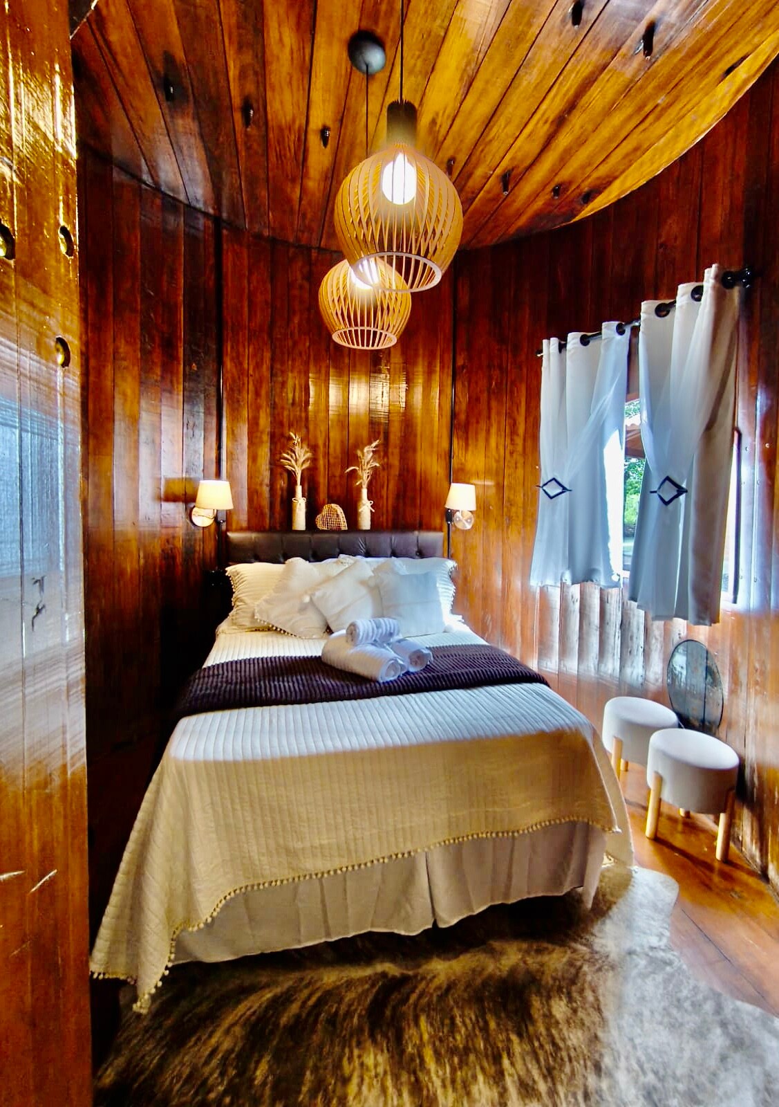 Com uma localização privilegiada, a cabana Mérica é aconchegante e moderna, tendo como base um container que já viajou o mundo. Possui uma área de 40m² integrada, com vista para os parreirais e árvores nativas da serra gaúcha. É equipada com utensílios domésticos e de higiene, além de uma confortável cama queen e de um sofá cama de casal. Na área externa você pode apreciar o pôr do sol no terraço, fazer um piquenique no jardim ou se reunir em volta do fogo de chão. Ideal para sair da rotina!