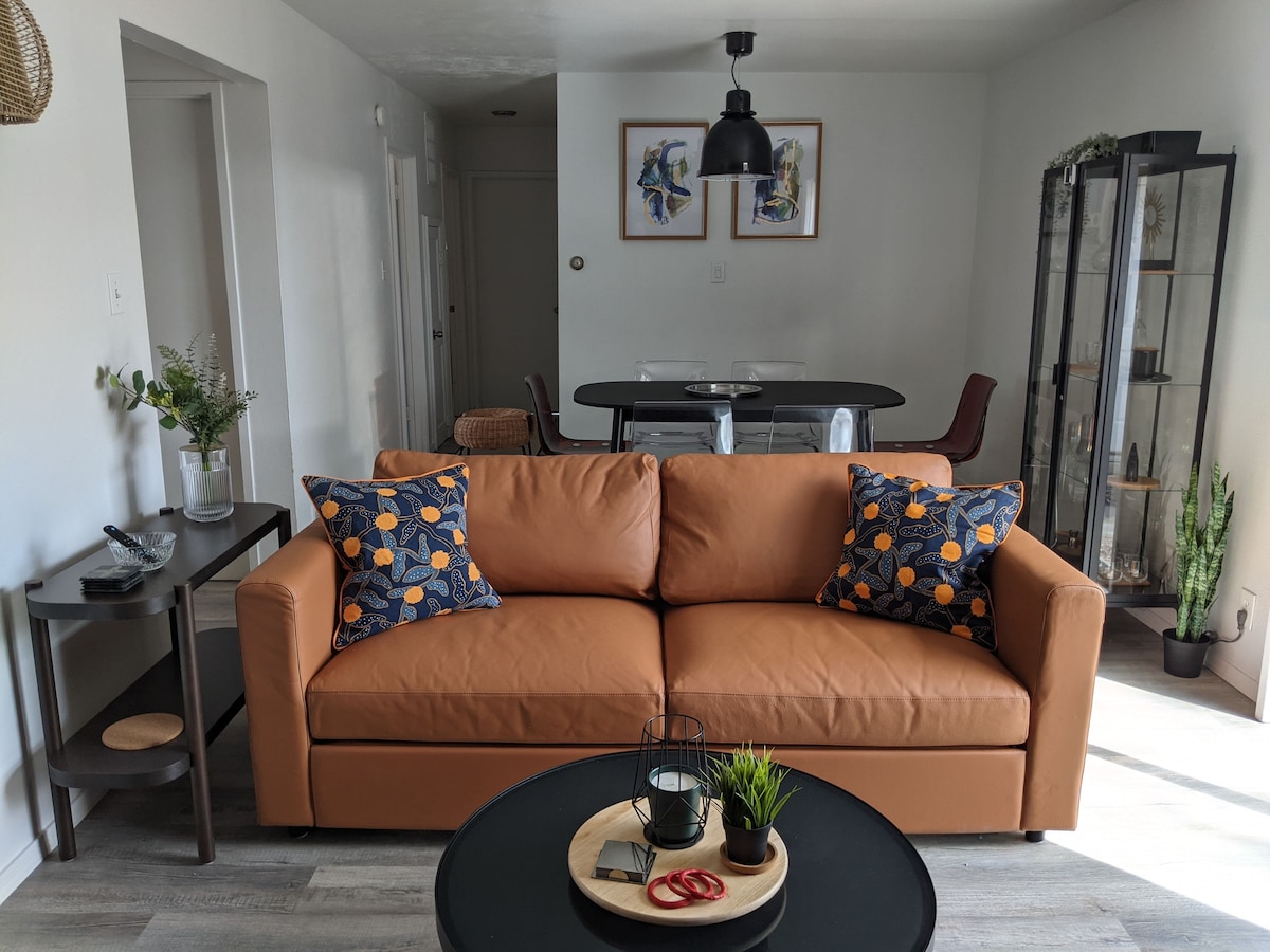 Situat molt a prop de l'autopista, la universitat, el districte mèdic i el centre comercial # UpscaleUptownABQ té una estètica suau de la gran ciutat i està dissenyat amb mobles nous d'Ikea. Els acabats de qualitat inclouen taulells de pedra nous, una cafetera gratuïta, llençols i tovalloles blanques de qualitat hotelera, un televisor de 75 polzades a la sala d'estar i televisors de 55 polzades a cada dormitori, una cuina totalment equipada i un carregador Electrify America de nivell 2 per als hostes amb vehicles elèctrics.