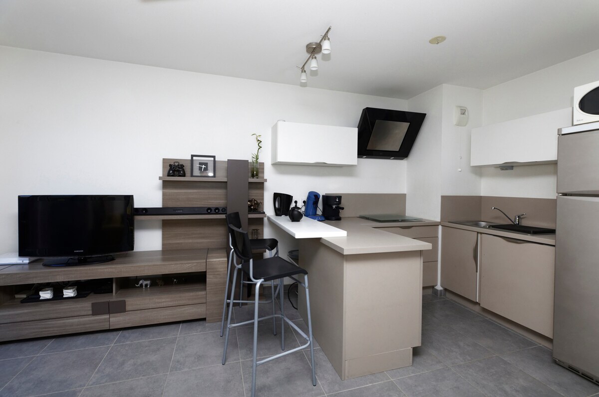 Pis modern i totalment equipat de 43 m² + terrassa de 15 m² moblat en una residència petita, tranquil·la i ben situada. Cuina totalment equipada + rentadora A un minut de: CHU, St Vincent clinic, Micropolis, fac bouloie, chataufarine,... Accés molt ràpid a les principals autopistes Un petit quart d'hora a peu fins al tramvia (parada CHRU Minjoz) o a prop de l'autobús CV: 15 minuts en cotxe o tramvia 1 aparcament a l'aire lliure davant de l'edifici Equipat amb fibraitelevisor Llit doble de 140x190