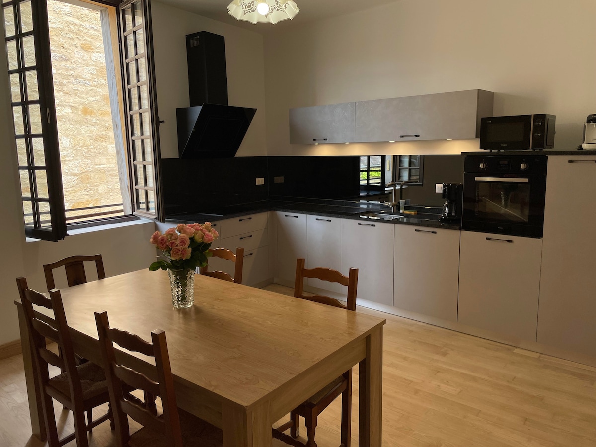 Situat al cor del centre històric de Sarlat, al famós carrer Montaigne, en una casa que data de l'Edat Mitjana, renovada el 2020 maximitzant el seu patrimoni (pedra, parquet), el pis de 64 m2 ofereix una terrassa i una vista excepcional de la Catedral de Sant Sacerdos i els jardins de l'Enfeux. Nota: per a grups o famílies nombroses, també és possible llogar la casa sencera, fins a 14 persones ("La Demeure de Bacchus", anunci d'Airbnb núm. 51800236).