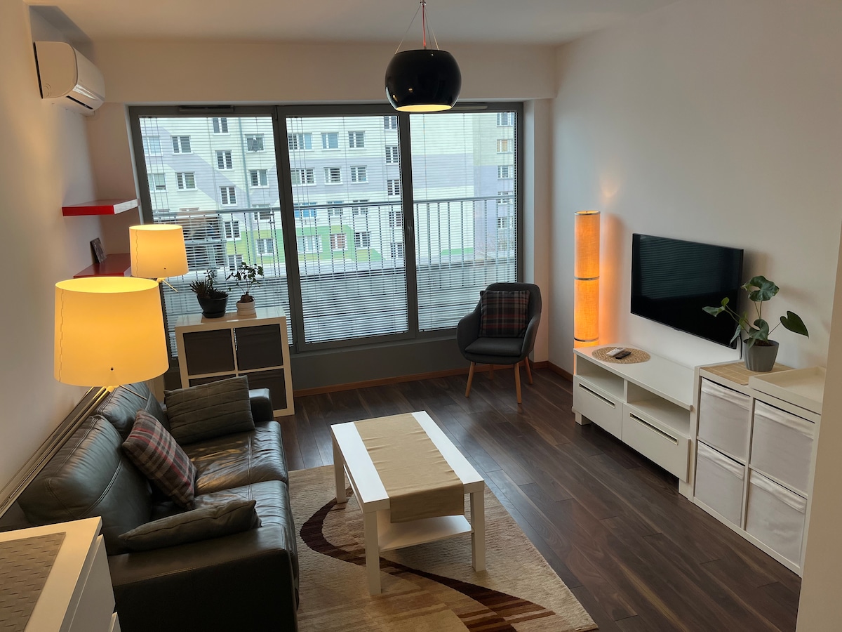 Còmode en tots els aspectes, aquest apartament està al costat del metro i del transport públic, en un dels millors districtes de Varsòvia, a prop del centre, a prop de parcs, restaurants, cafeteries i botigues. L'apartament impecable és assolellat i acollidor. Té un balcó amb una bonica vista de Varsòvia. Perfecte per a parelles, solters, viatgers de negocis i famílies amb nens. El lloguer inclou televisió per cable gratuïta (canals polonesos i internacionals), internet wifi de 100 Mbs i garatge subterrani.