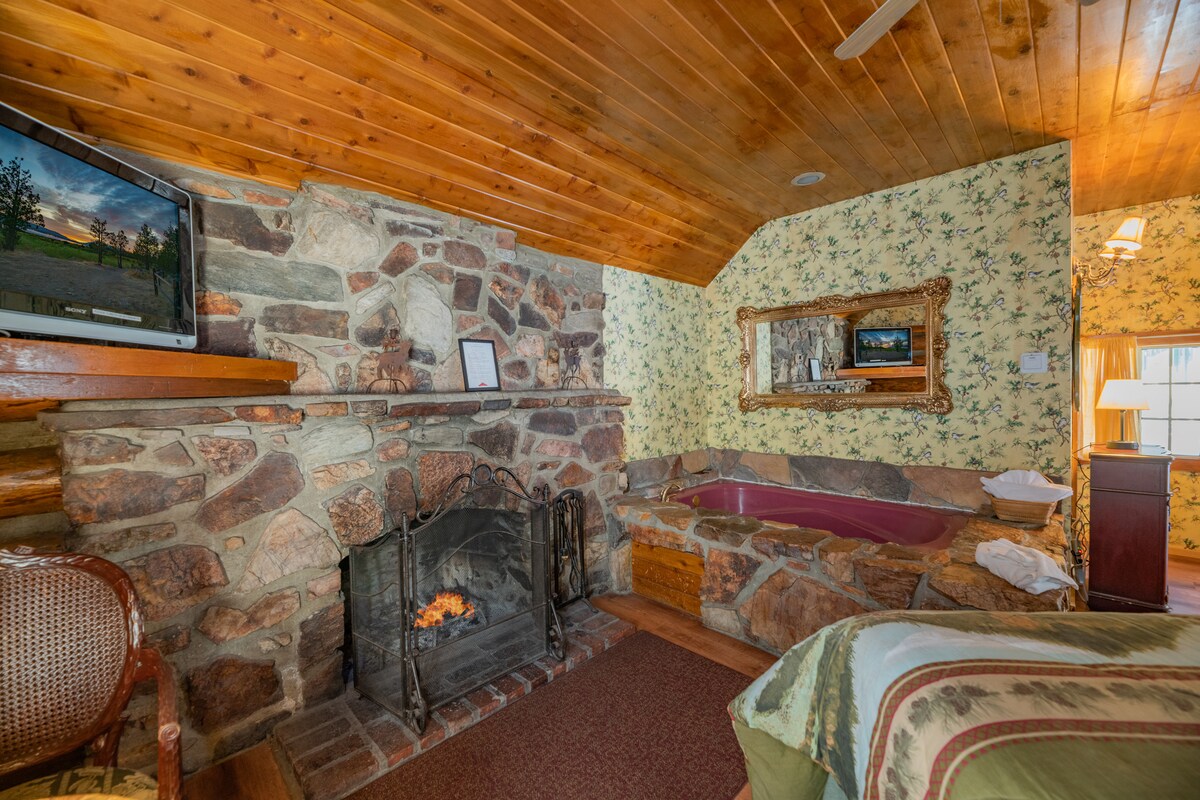La caseta de fusta és un refugi històric privat que admet mascotes, construït el 1894, situat en un racó aïllat de la nostra propietat de 14 000 metres quadrats plena de pins. Aquest acollidor refugi disposa d'un llit «queen size», una llar de foc de pedra, una banyera d'hidromassatge gran, un bany privat i una mininevera. Els hostes gaudeixen de vistes a la muntanya, accés a una banyera d'hidromassatge compartida i a poca distància a peu de Big Bear's Village, el llac i els restaurants. Ideal per a parelles que busquen una escapada encantadora i rústica amb un autèntic caràcter de caseta.