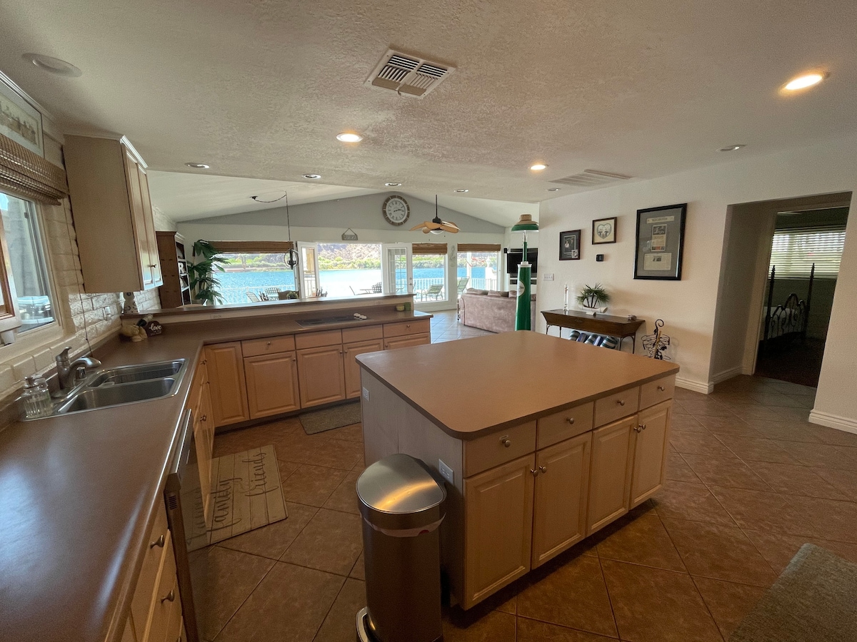 Situada al centre del riu Colorado, a Parker AZ, la nostra casa personalitzada de 3 dormitoris i 2 banys amb un gran pati i terrassa. A 100 metres a peu de Road Runner. Espai exclusiu del moll i accés a l'aigua. Magnífiques vistes amb espai per passar- t'ho bé! Fàcil accés a esports aquàtics, navegació, moto aquàtica, surf de rem, golf, senderisme, pesca, caça, muntar tot terreny, jugar al casino, gaudir de la companyia amb altres persones o simplement seure al costat del riu gaudint de les vistes i de les impressionants postes de sol.