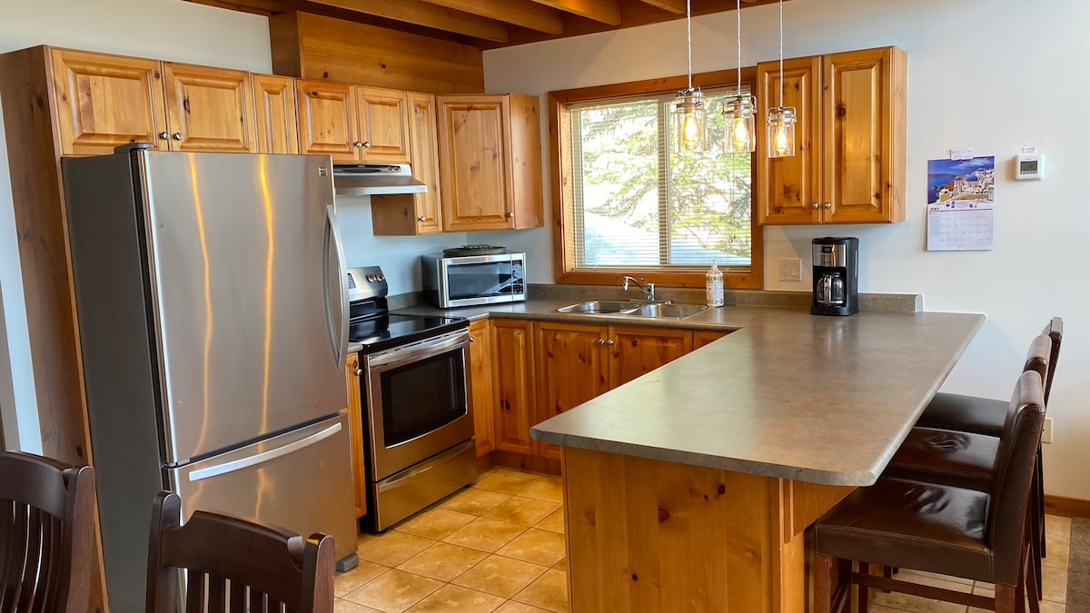 Bonica, neta i lluminosa amb una àmplia llum natural, amb capacitat per a 8 persones, perfecte per a 2 famílies amb nens. Esquí curt fins als teles cadires Snow Ghost & Ridge Rockets. Edifici familiar per a una estada tranquil·la i tranquil·la. 2 places d'aparcament directament a l'exterior, una banyera d'hidromassatge privada amb vistes a la muntanya, una barbacoa, Xbox 360 amb una biblioteca de jocs, un reproductor de DVD amb una gran selecció de pel·lícules, Roku per a Netflix, Disney+, Prime, jocs de taula i de cartes, televisió per cable Telus i wifi + un sistema d'àudio Sonos.