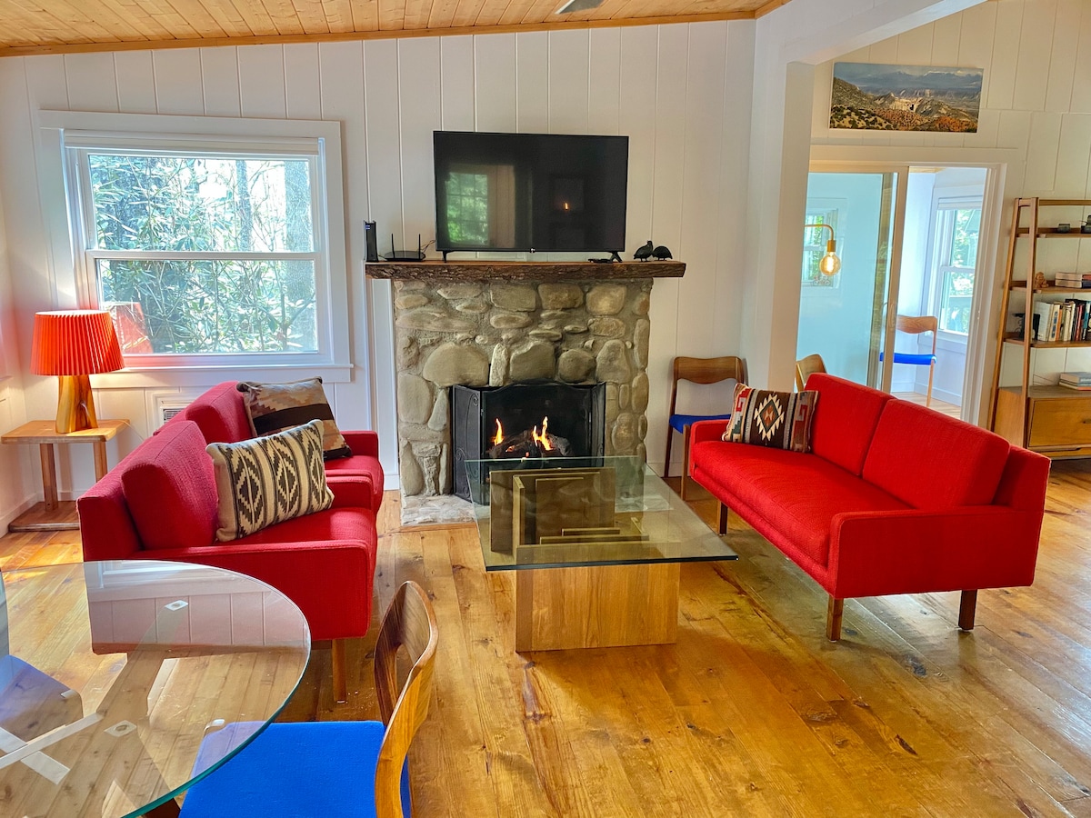 Relaxa't sota les estrelles a la terrassa de ioga mentre el rierol gorgota, o sota el porxo cobert de la banyera d'hidromassatge. Gaudeix de les vistes a la muntanya, l'estil MCM i la natura, a minuts de senderisme, restaurants, compres, cerveseries i Asheville. La caseta està totalment actualitzada i ofereix tots els serveis: llar de foc de gas, foguera, zona de pícnic, banyera d'hidromassatge i accés al rierol. Situat en un barri tranquil en un terreny de mig acre, a 1 milla de Black Mountain, a 5 milles de Montreat, a 15 minuts del centre d'Asheville.
